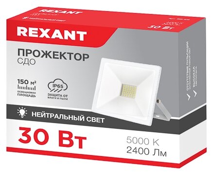 Rexant 605-025 Прожектор светодиодный СДО 30Вт 2400Лм 5000K нейтральный свет, белый корпус