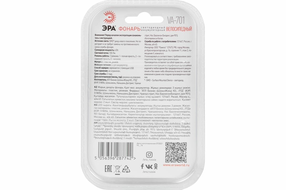 Фонарь велосипедный ЭРА VA-701 (Б0052321)