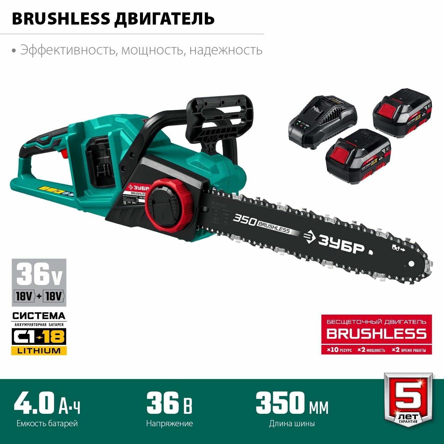 Бесщеточная цепная пила ЗУБР 36В 2х18В АКБ 4Ач ПЦЛ-3635-42
