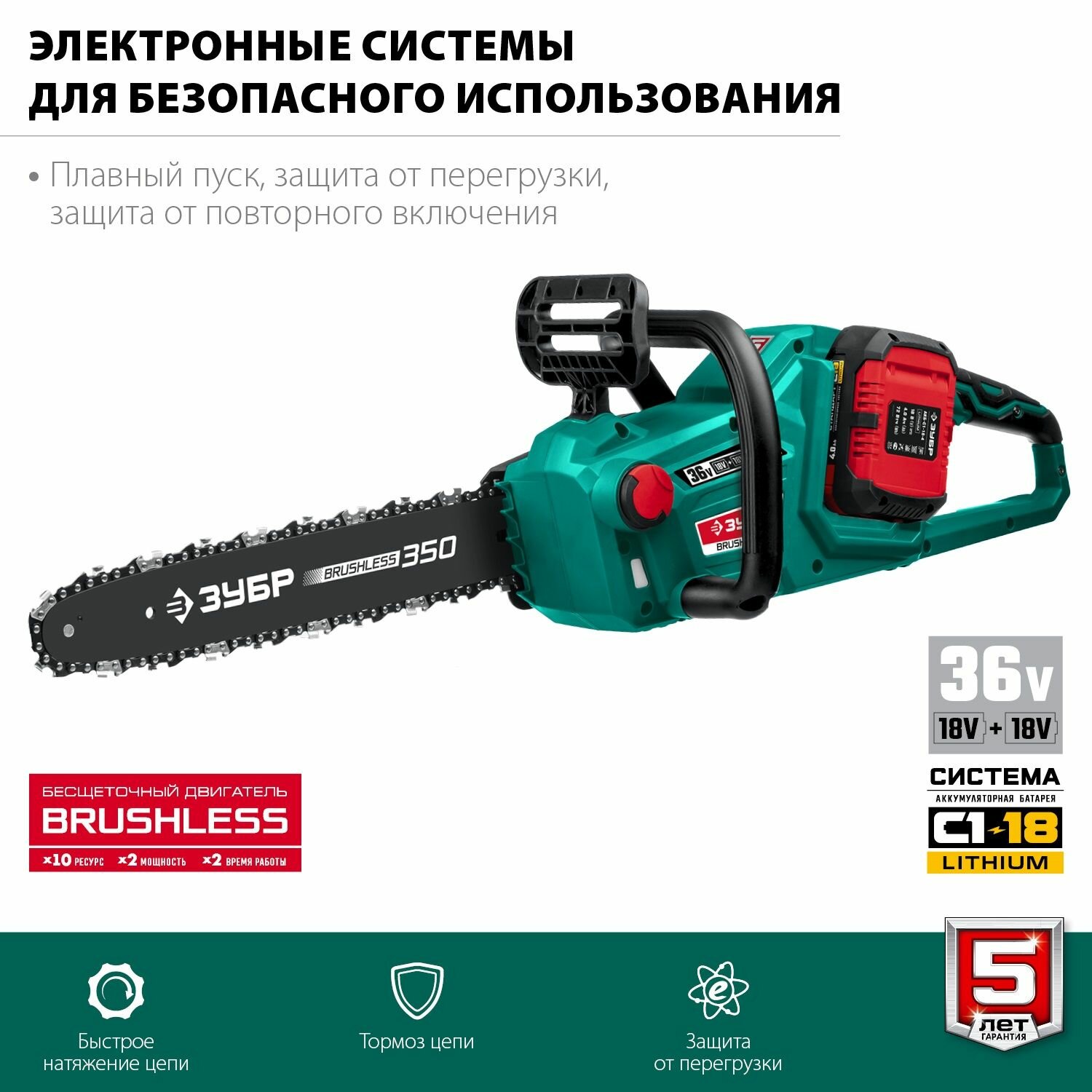ЗУБР ПЦЛ-3635-42 36В бесщеточная пила цепная, 2х18В АКБ (4Ач).