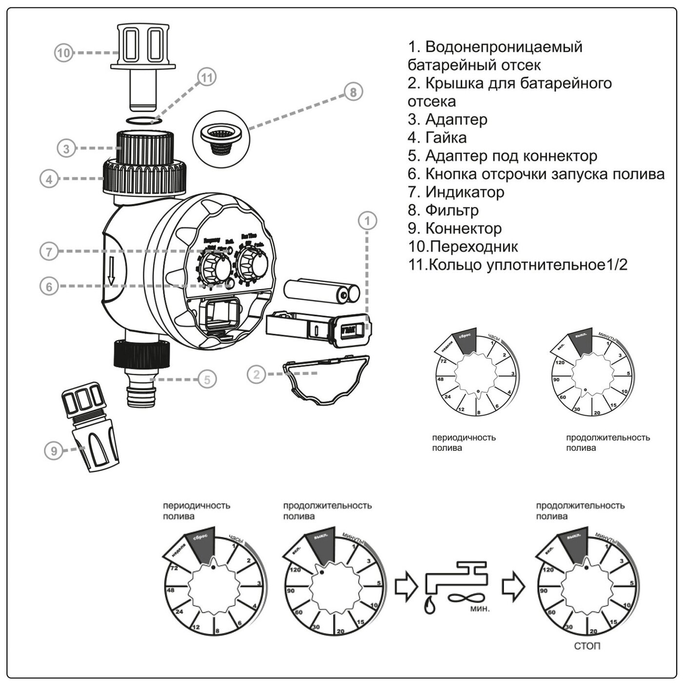 | Комплектация | электронный таймер с механическим управлением и шаровым клапаном с входным резьбовым соединением 1/2 и адаптером под коннектор |