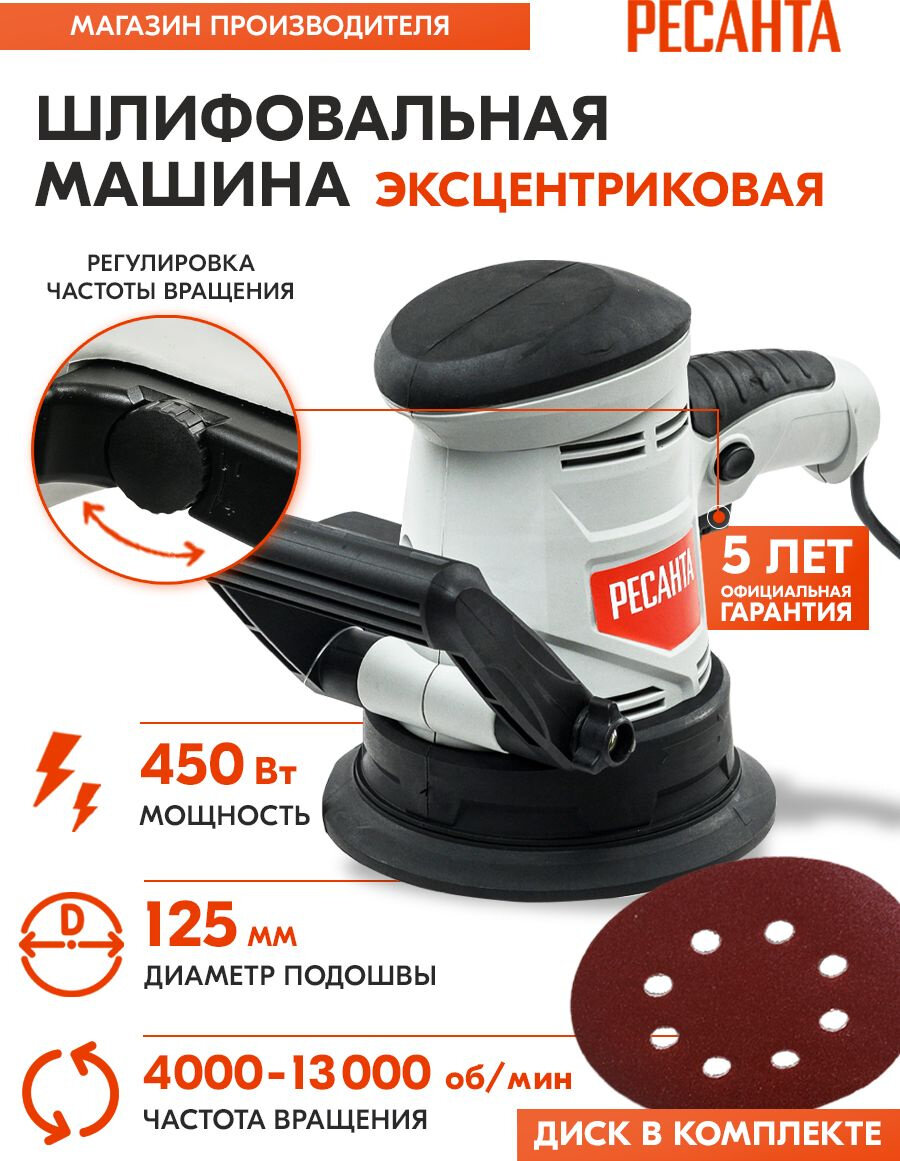 Эксцентриковая шлифовальная машина ЭШМ-125Э Ресанта, 450 Вт, амплитуда 2.4мм