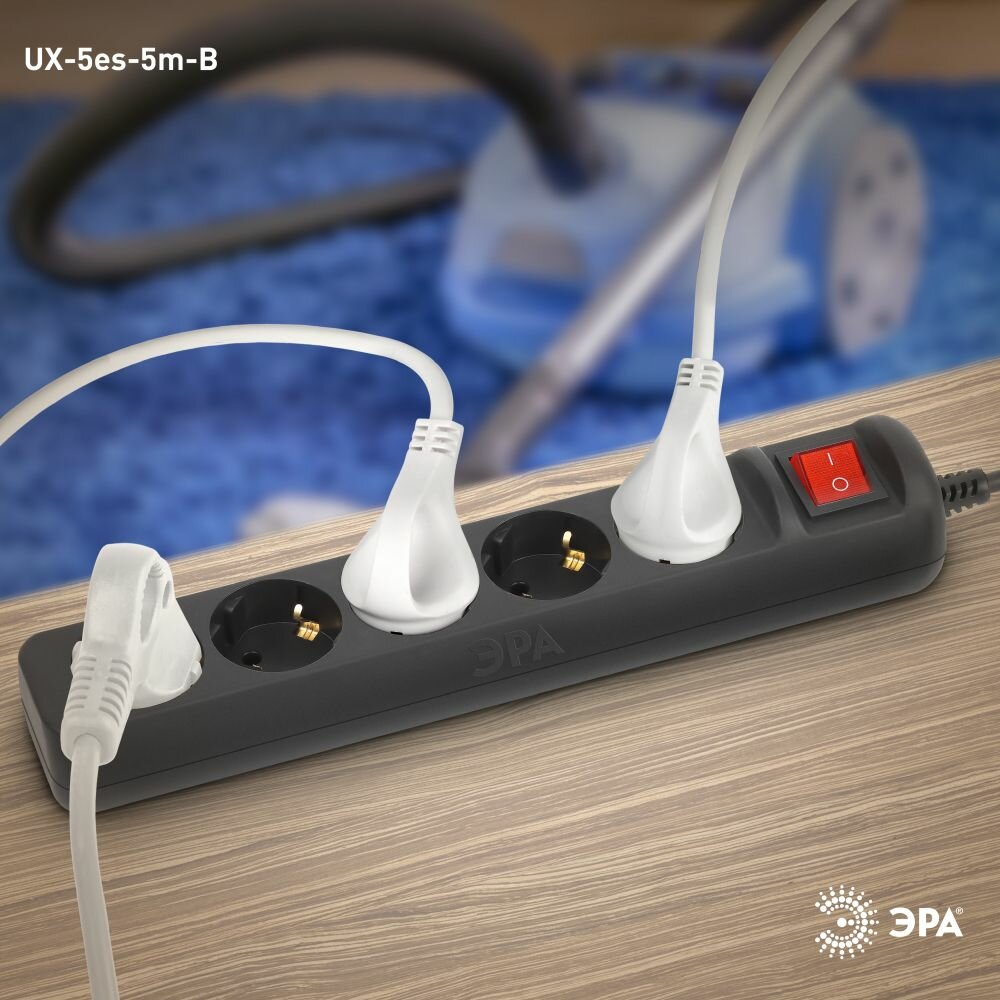 Купить ЭРА Б0057732 Удлинитель электрический UX-5es-5m-B с заземлением с выключателем 5 розеток 5 м ПВС 3x0,75мм2 10А черный