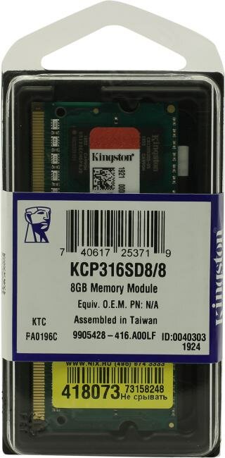 Модуль памяти Kingston KCP316SD8/8 Branded DDR-III 8GB (PC3-12800) 1600MHz SODIMM