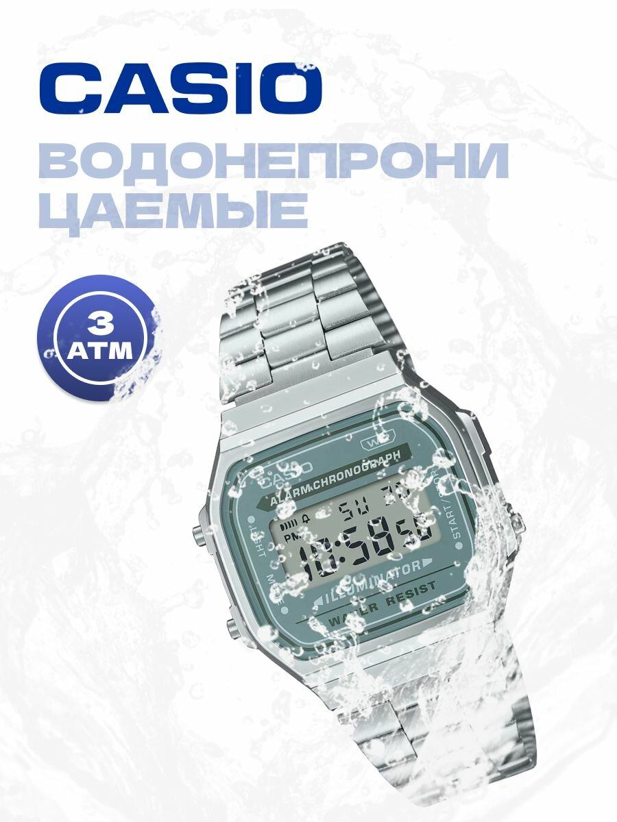 A168WEM-2E Casio наручные часы кварцевые WR30 (3 атм) мужские, женские серебряный, голубой секундомер будильник отображение числа, отображение дня недели, отображение месяца подсветка дисплея акриловое стекло
