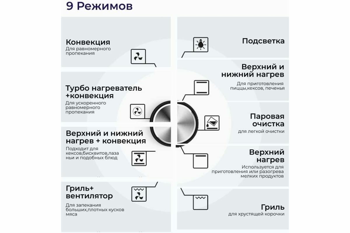 | Режимы нагрева | большой гриль, верхний нагрев, верхний нагрев + конвекция, верхний нагрев + нижний нагрев, конвекция |
