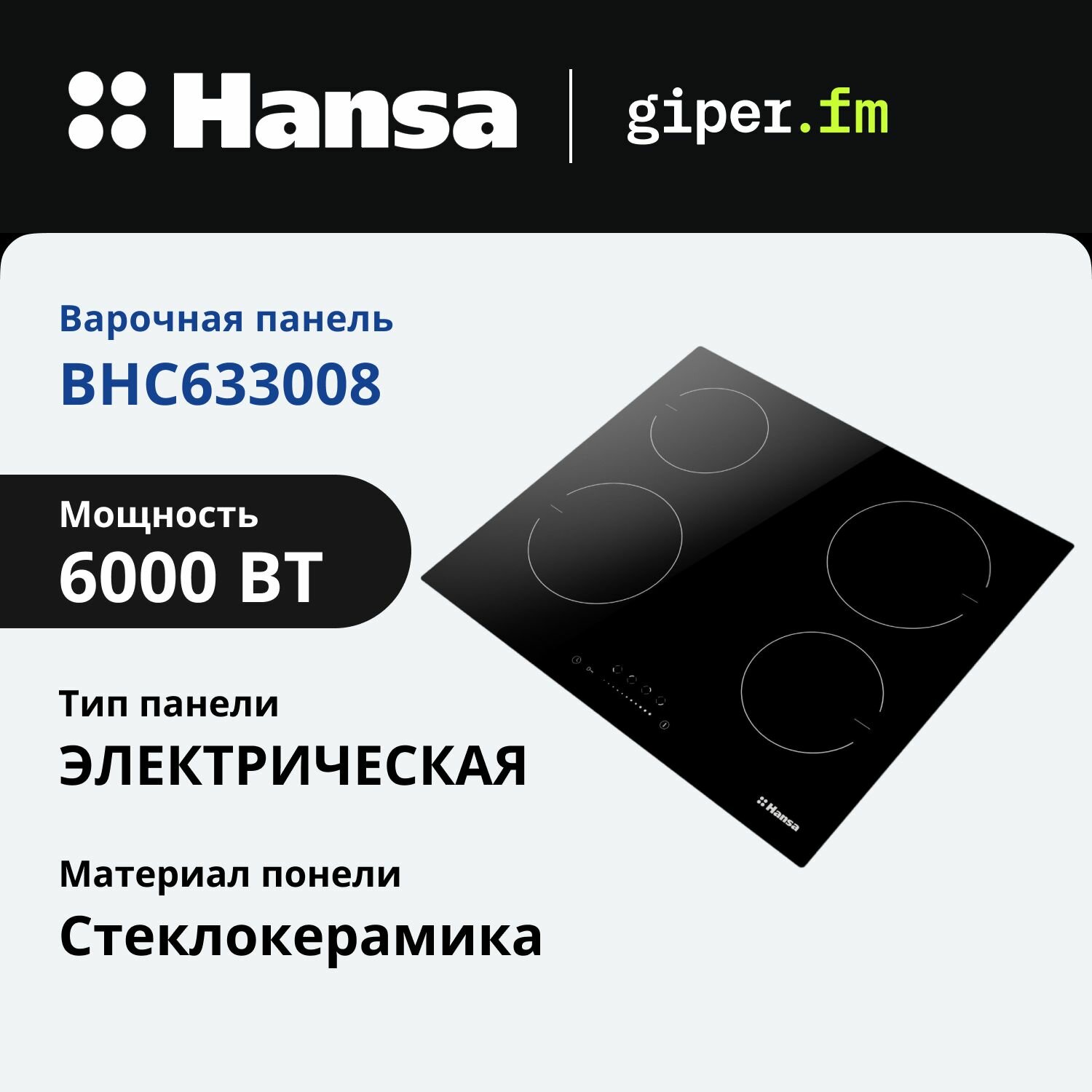 Электрическая варочная панель Hansa BHC633008, стеклокерамическая поверхность, блокировка от детей, таймер, автоотключение, индикация остаточного тепла, черная