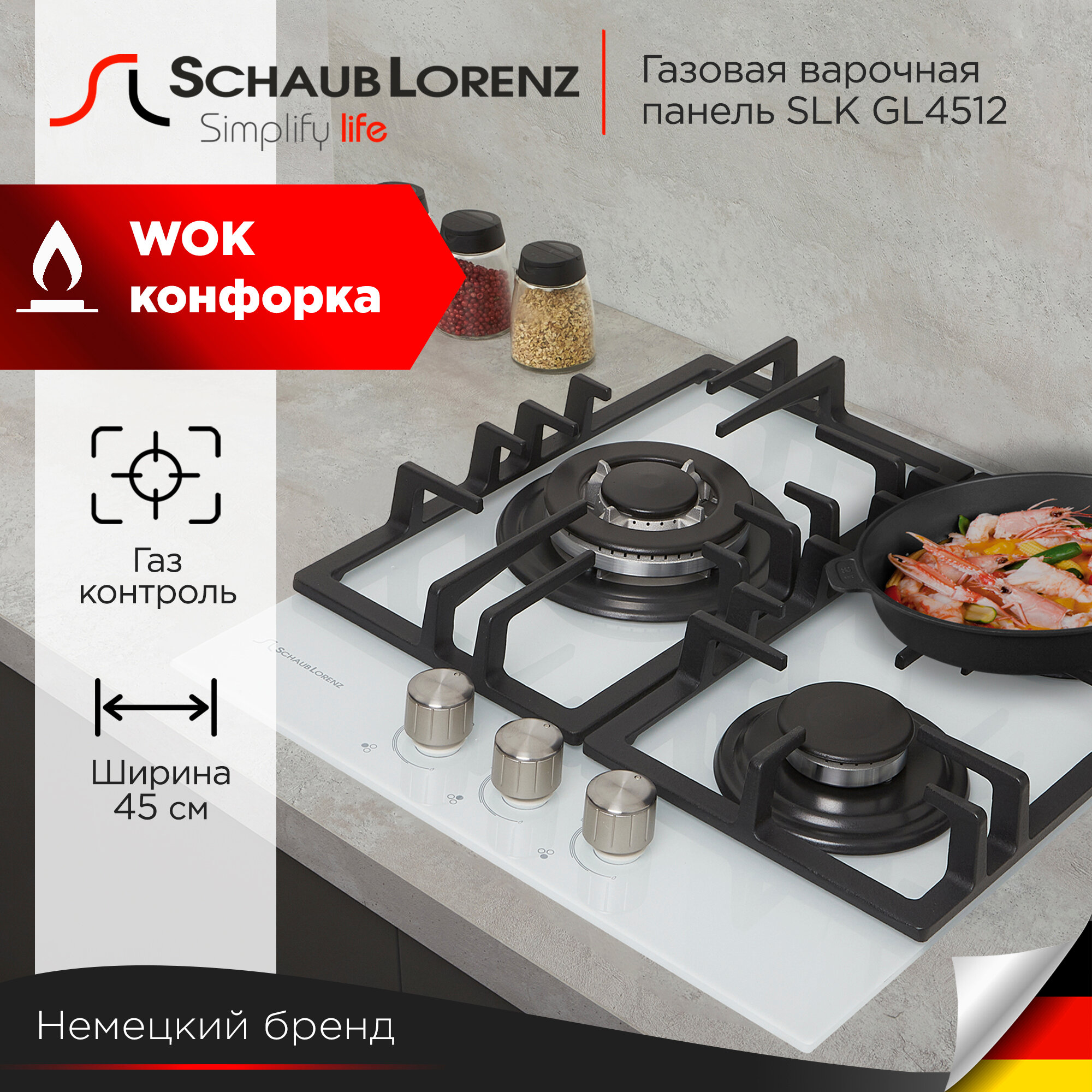 Купить Газовая варочная панель Schaub Lorenz SLK GL4512, 45 см, газ-контроль, электроподжиг, WOK