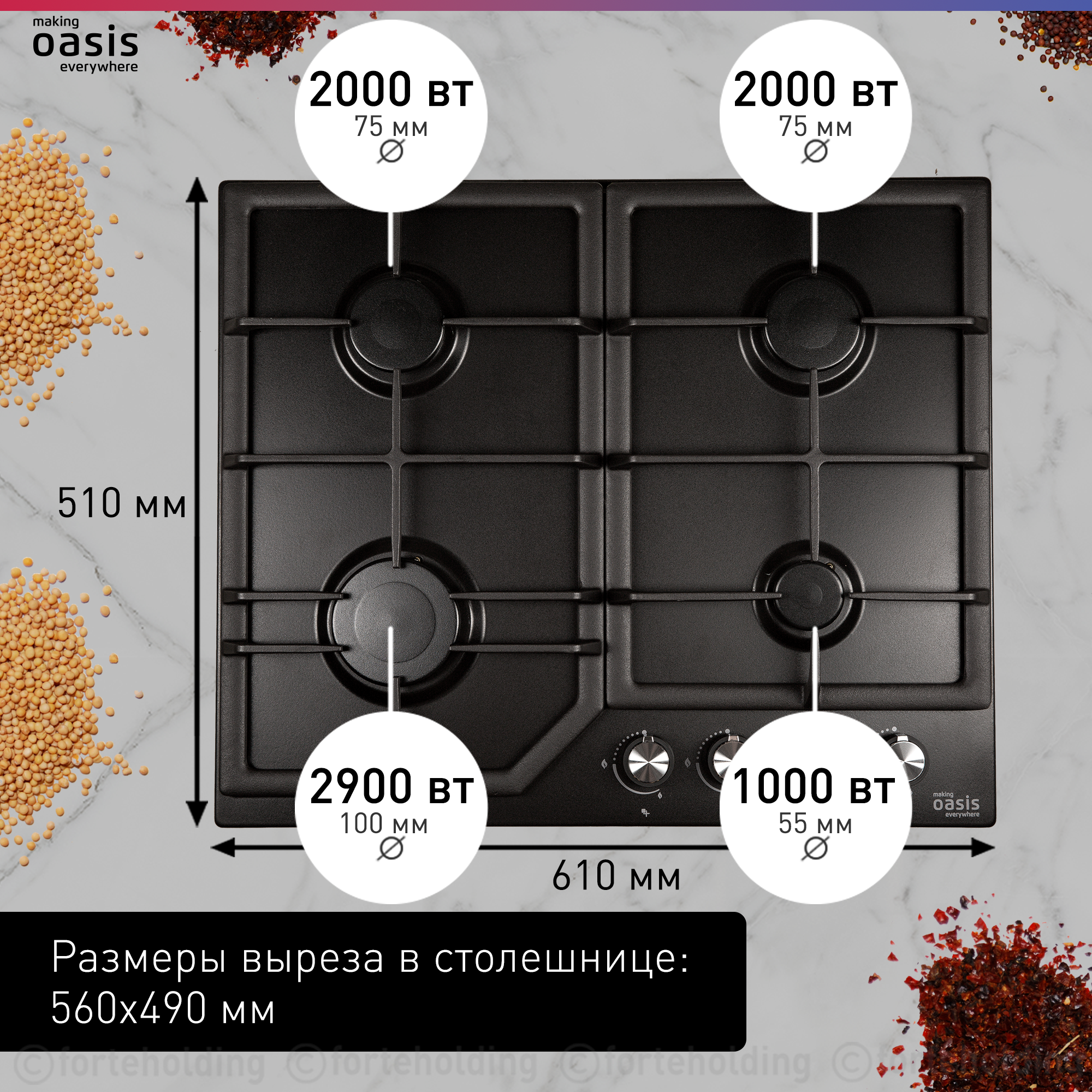 Варочная панель встраиваемая Oasis P-MBR, эмаль, черная, газ-контроль, чугунные решетки, 4 конфорки