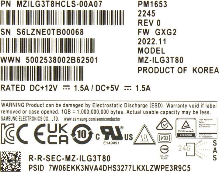 MZILG3T8HCLS-00A07 2.5", 3840GB, Samsung Enterprise SSD PM1653, SAS 24 Гб/с, 1DWPD (5Y)