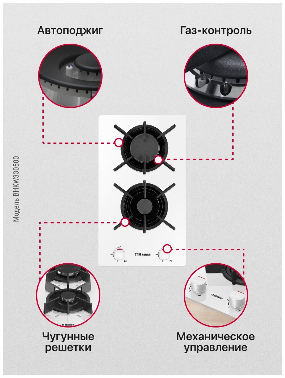 Газовая варочная панель Hansa BHKW330500, двухконфорочная, стеклянная поверхность, с газ-контролем и автоподжигом, белая