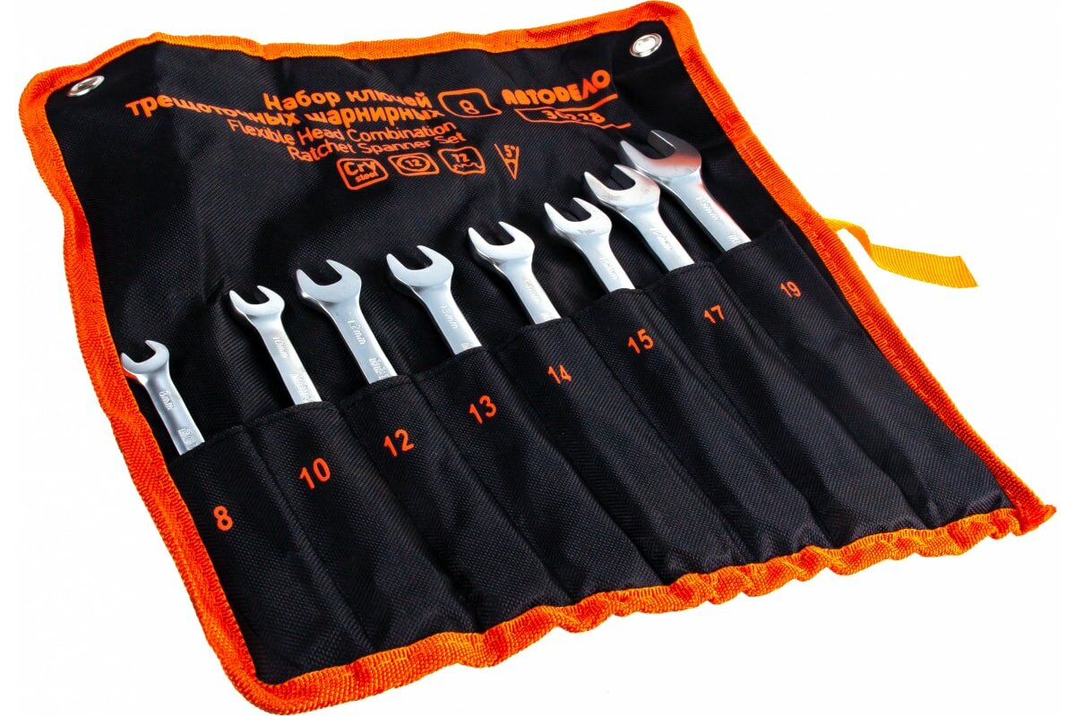 Набор ключей рожково-накидных 8 шт Автодело (трещоточные, шарнирные, 8 предметов, 8-19 мм) тетроновая сумка