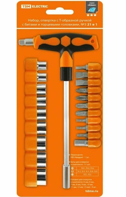 TDM Набор, отвертка с Т-образной ручкой с битами и торцевыми головками, №3, 21 предмет "Алмаз" SQ1019-0203