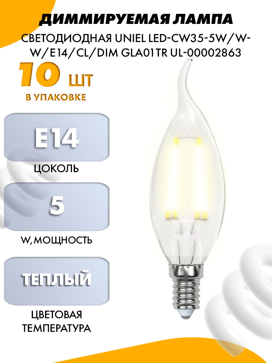 Типы/Лампочки/Филаментные Uniel Лампа светодиодная филаментная Uniel E14 5W 3000K LED-CW35-5W/WW/E14/CL/DIM GLA01TR UL-00002863