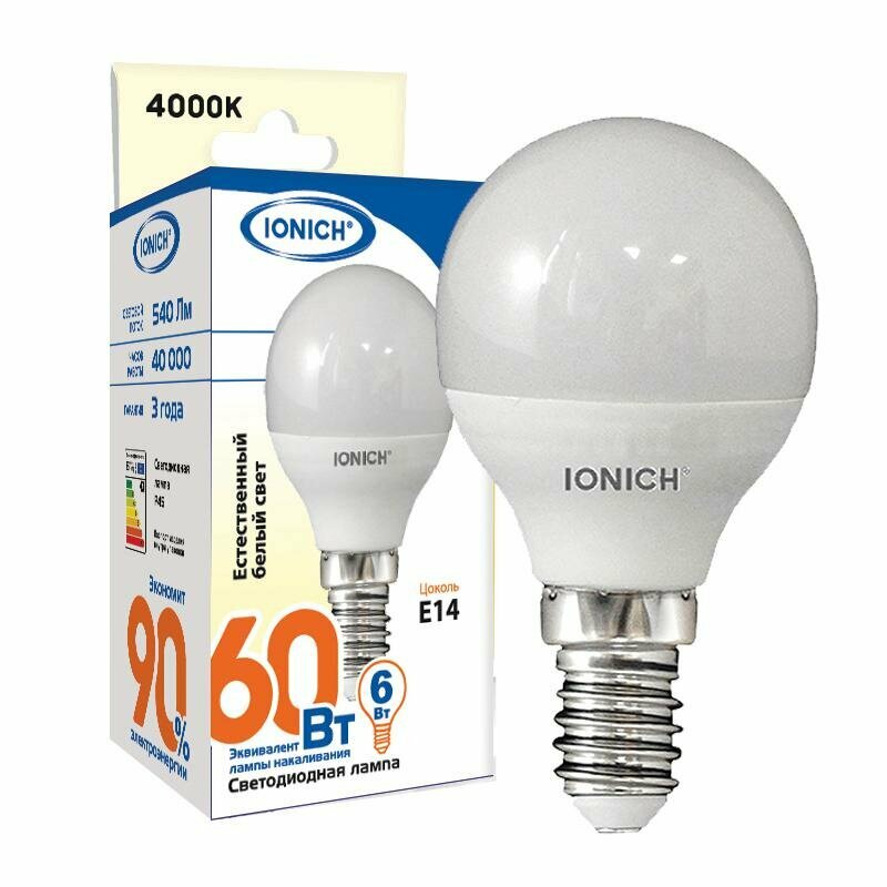 Купить Лампа IONICH "Шар" 6Вт 4000К (Е14) 10шт