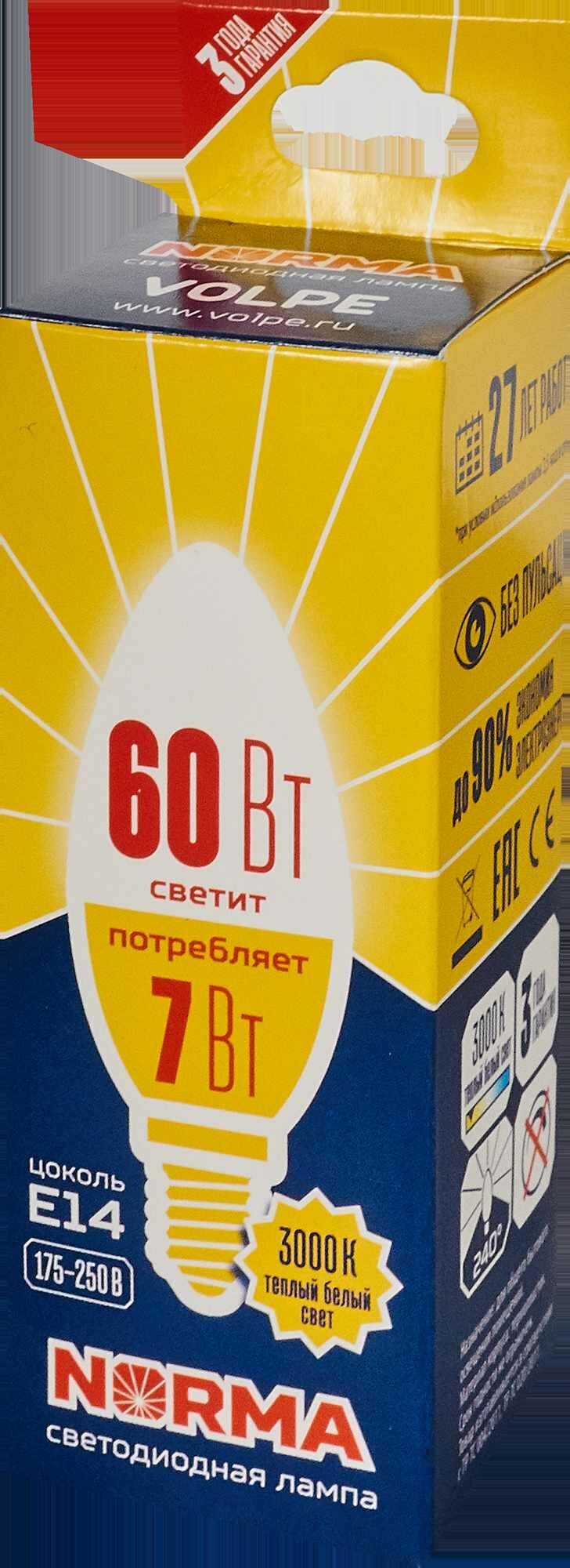 Лампа светодиодная Volpe Norma E14 220 В 7 Вт свеча 600 лм, тёплый белый свет