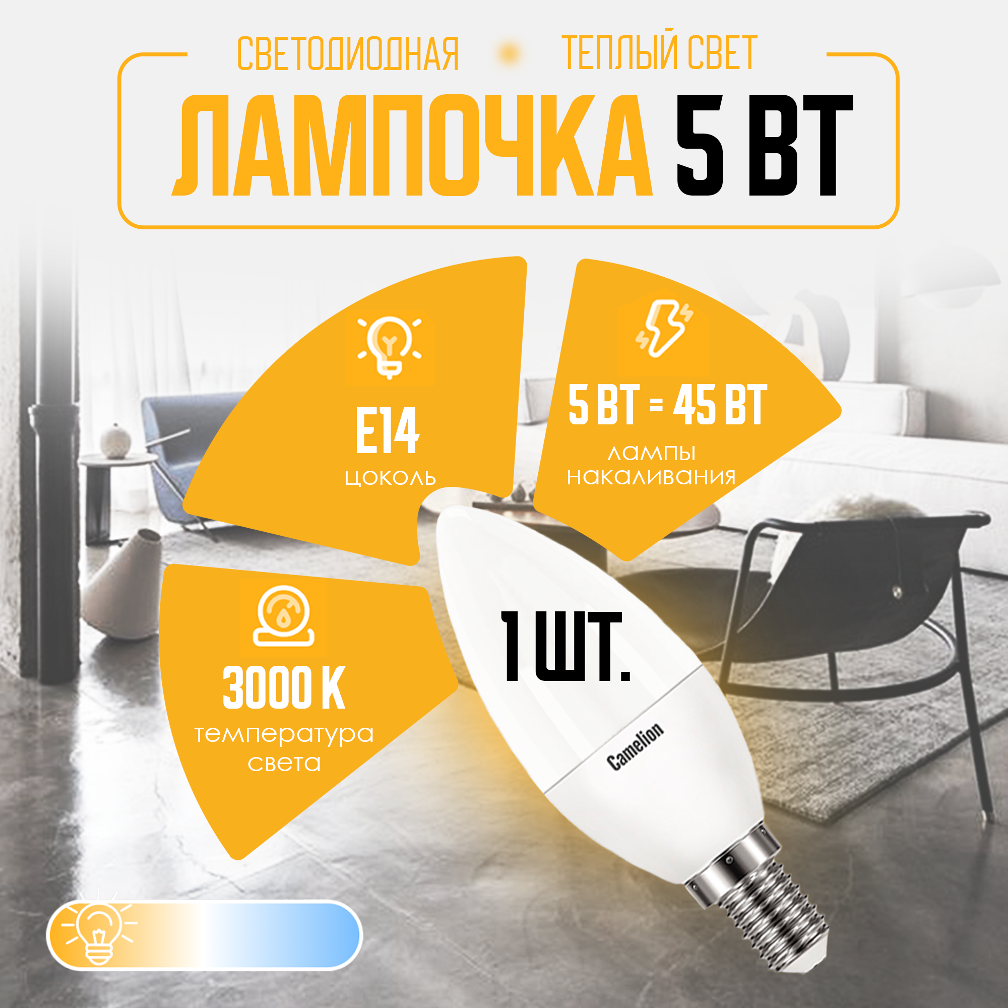 Купить Лампа CAMELION Е14 5Вт 3000K 410Лм LED5-C35/830/E14 светодиодная 12031 теплый белый, свеча