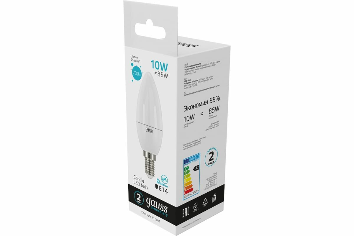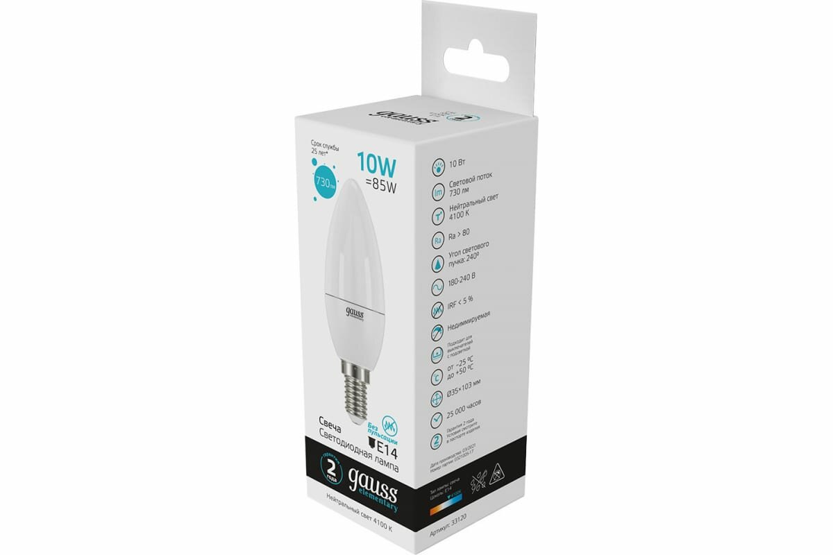 (10 шт.) Светодиодная лампочка Gauss Elementary Свеча E14 10W(730lm) 4100K 4K 110x38 матовая, пластик/алюм. 33120