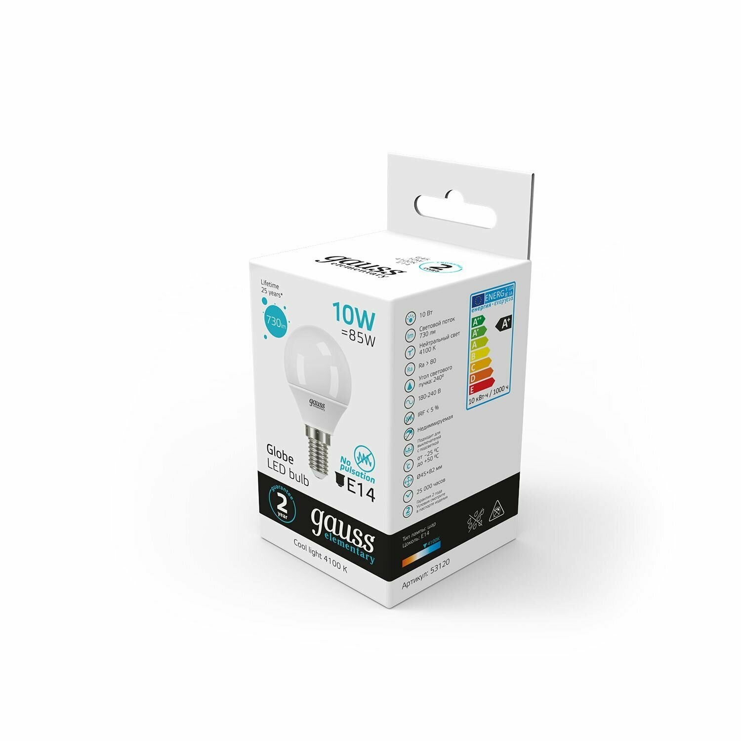 (20 шт.) Светодиодная лампочка Gauss Elementary Шар G45 E14 10W(730lm) 4100K 4K 86x45 матовая, пластик/алюм. 53120 Нейтральный белый. Цоколь E14