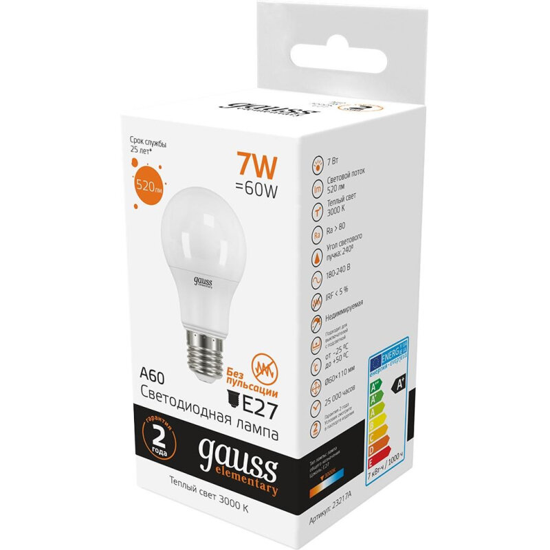 Сохранить23217A Лампа Gauss A60 7W 520lm 3000K E27, уп.10шт интересное: