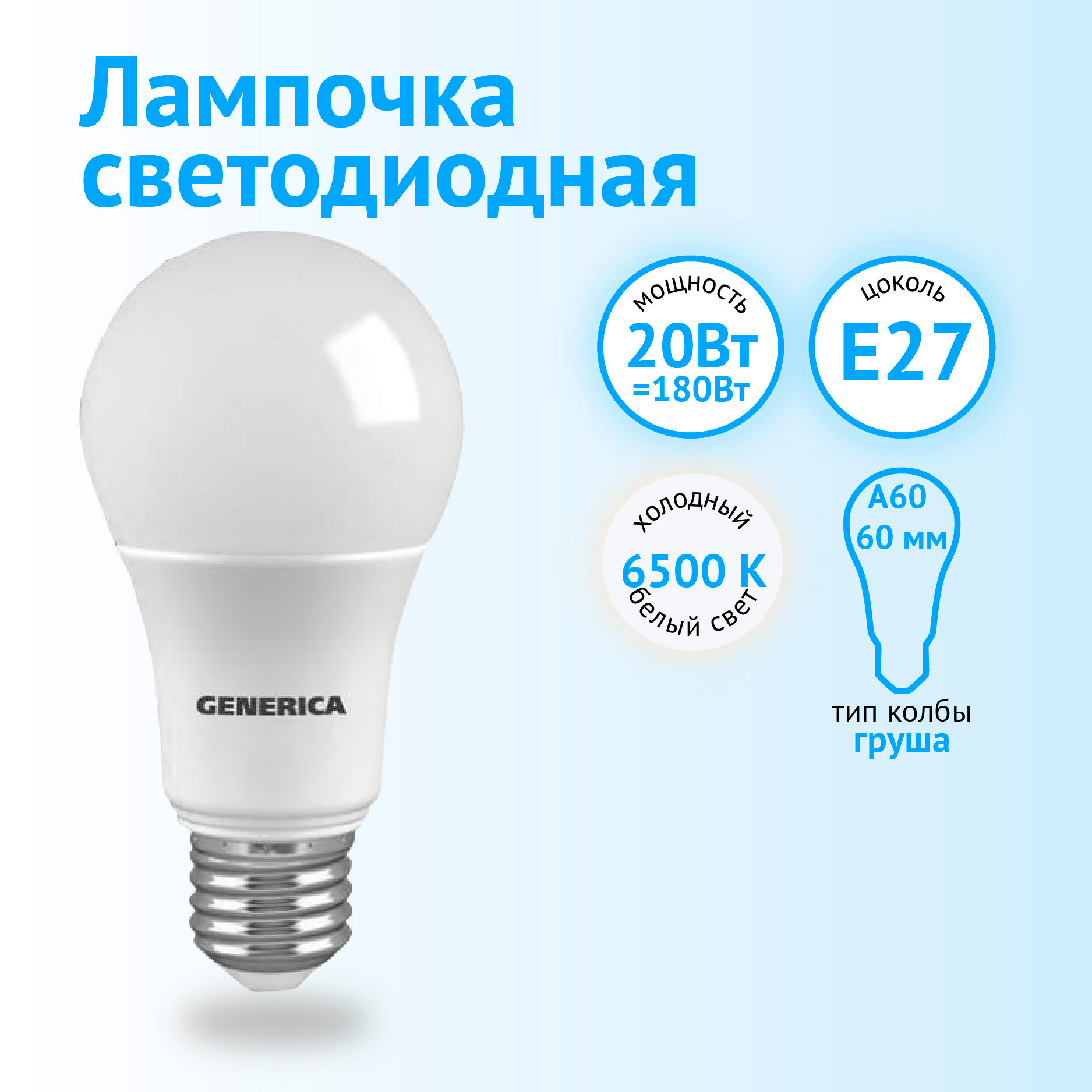 (6 шт.) Светодиодная лампочка GENERICA LED A60 груша, мощность 20 Вт, напряжение питания 220 В, цветовая температура 6500 К, холодный белый свет, цоколь E27, размер 60х125 мм