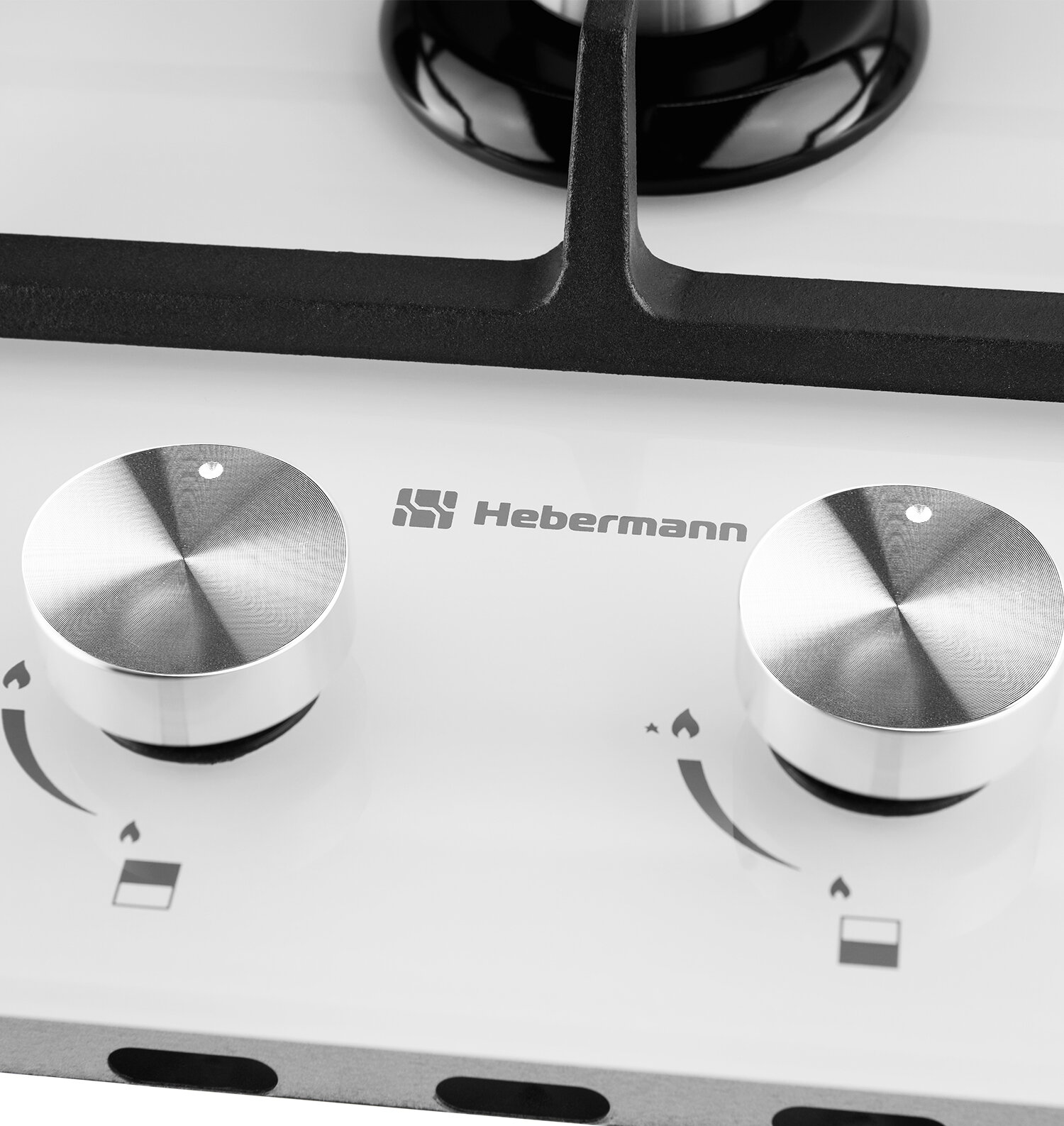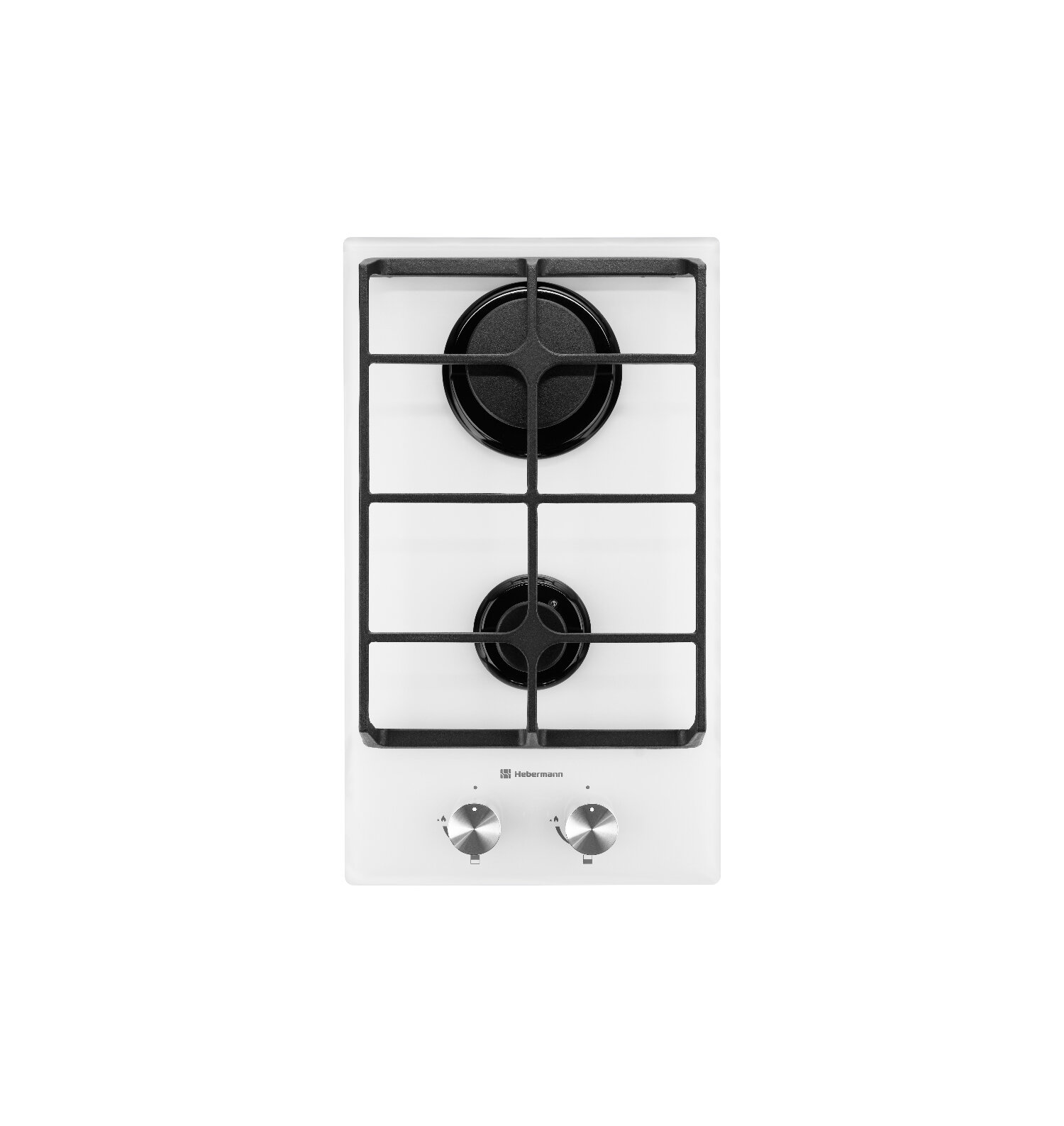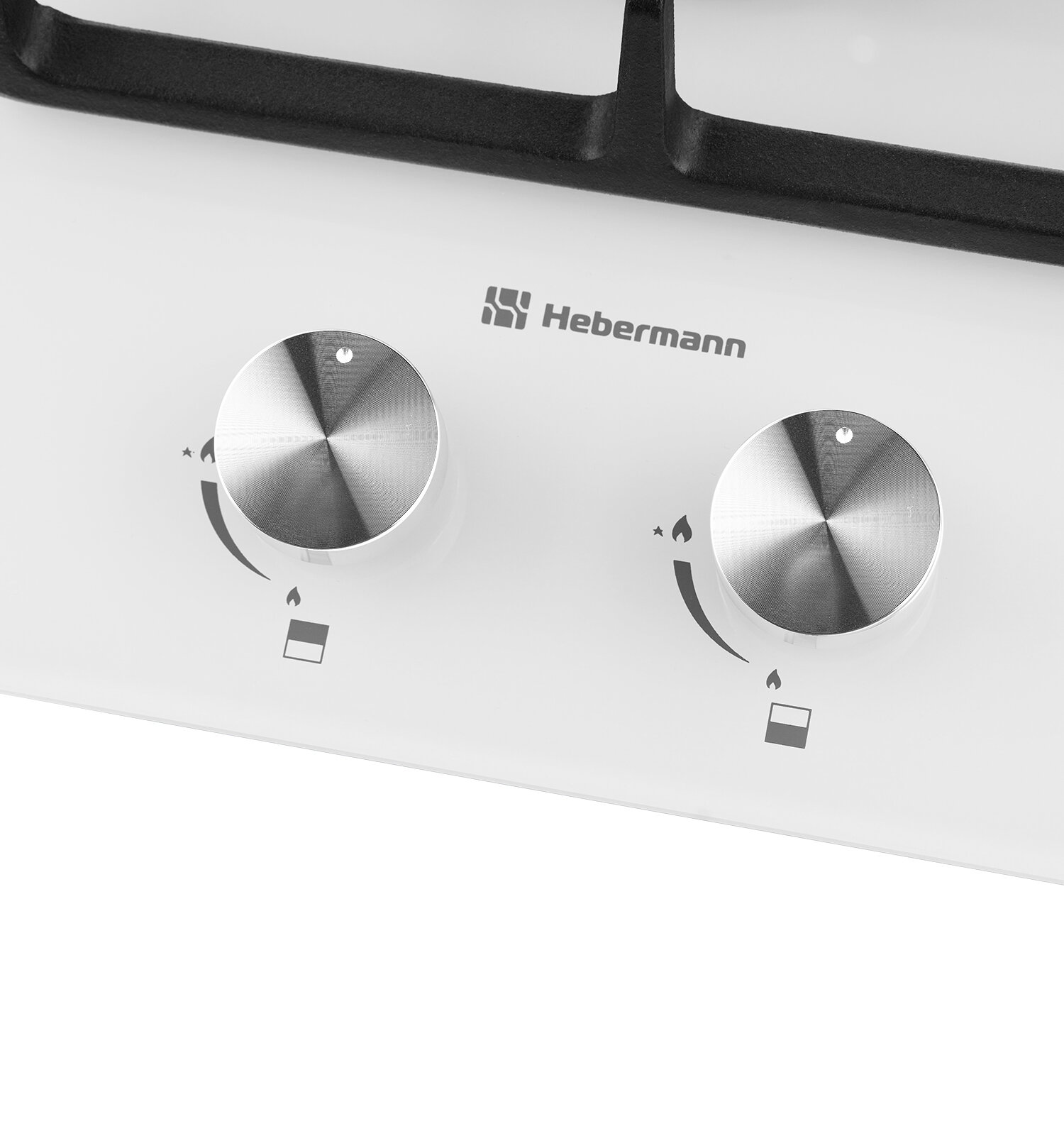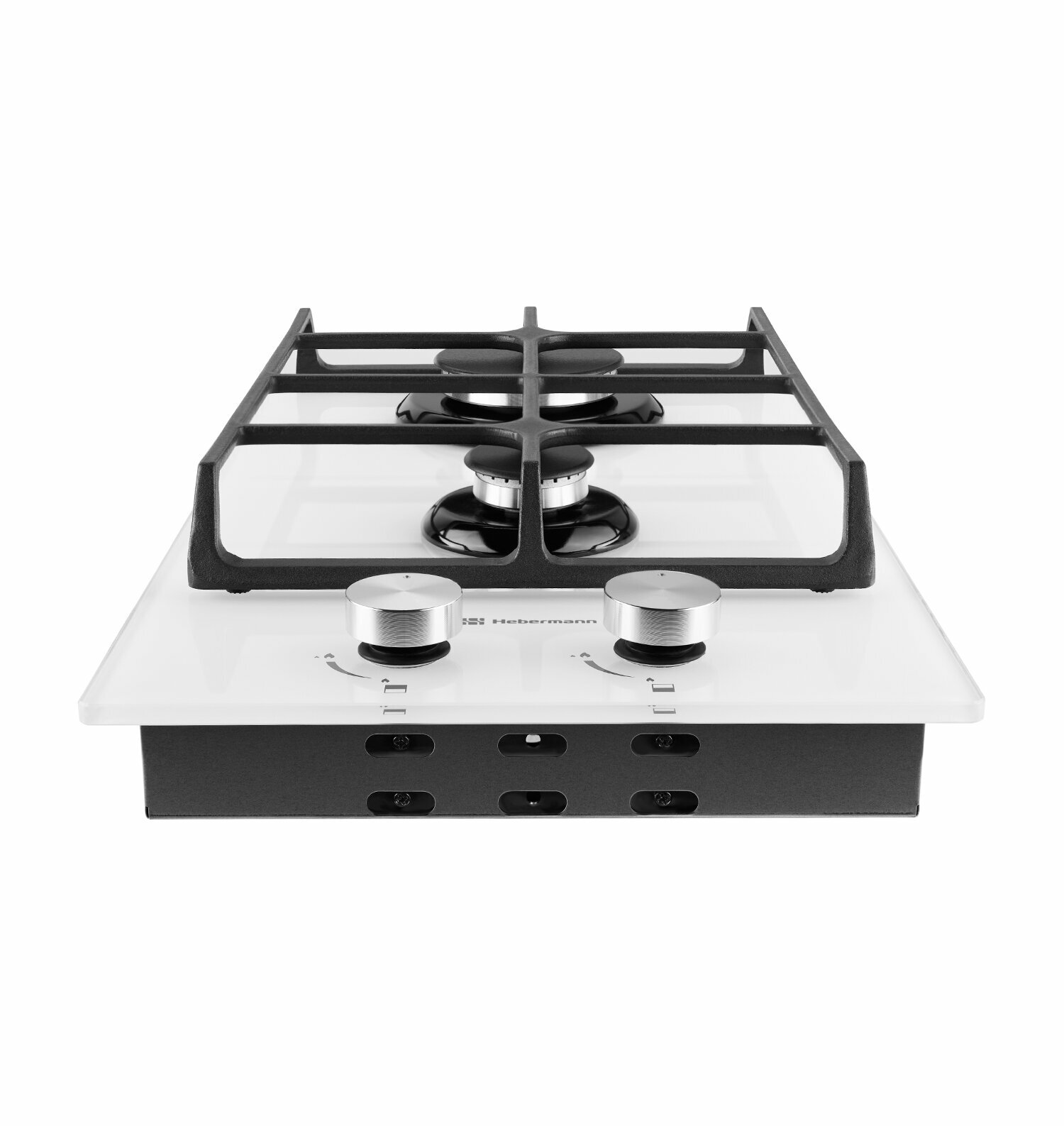 Купить Варочная панель газовая 2 конфорки Hebermann HBGG 302.1 W, Материал поверхности: Закалённое стекло, Материал решёток: Чугун, Термостойкие ручки Hitech, Управление: Механическое, Электроподжиг, Газ-контроль