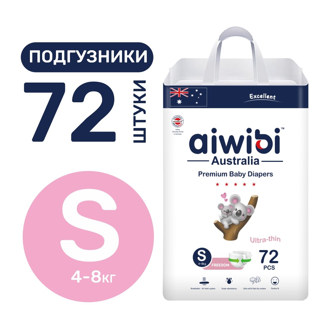 Купить Подгузники 4-8кг Aiwibi Australia Premium S / кол-во 72 шт