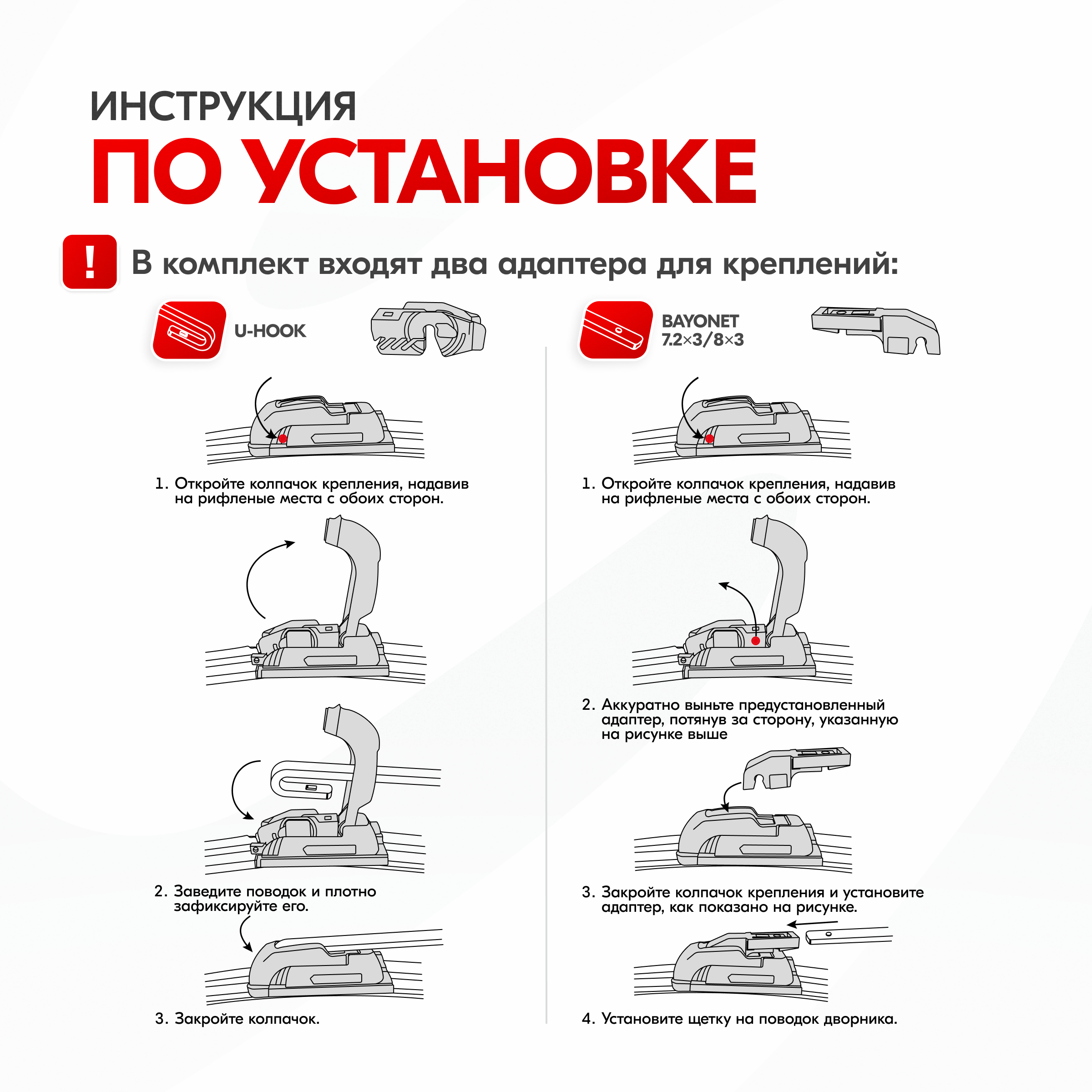 | Подробная комплектация | Щетка бескаркасная - 1 шт. Адаптер - 1 шт. Упаковка - 1 шт. |