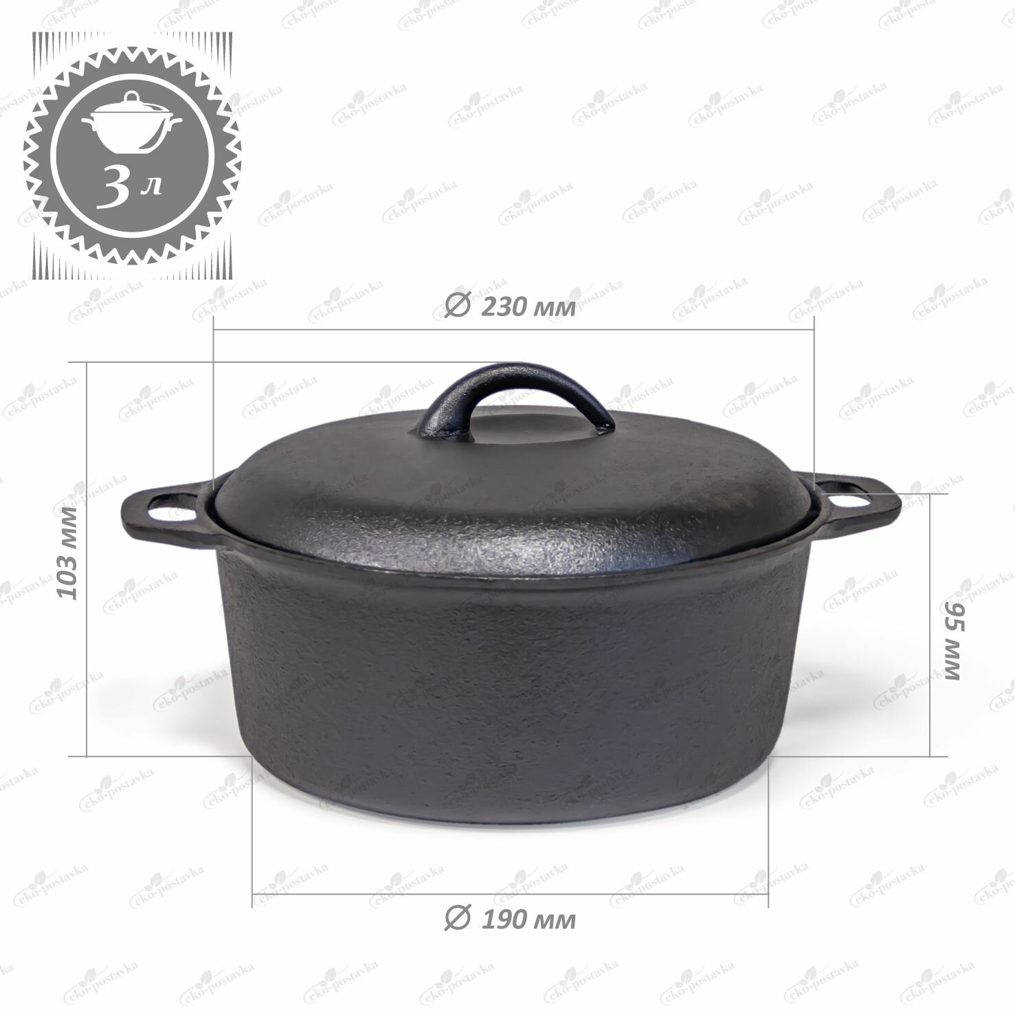 | Плюсы: | Она чугунная и с чугунной крышкой. Объёма 3 литра вполне достаточно. Удобные ручки и на кастрюле и на крышке. Плоское дно |