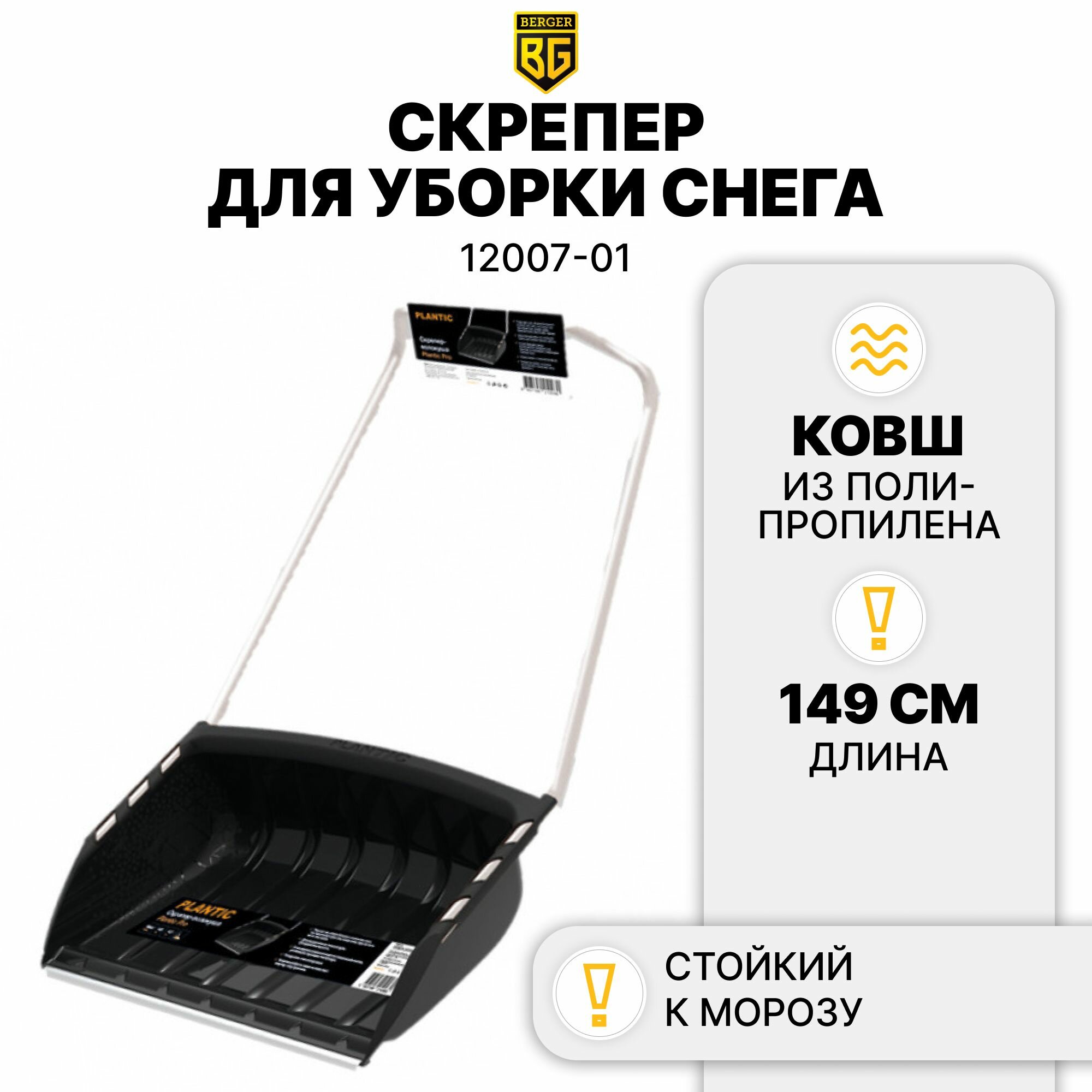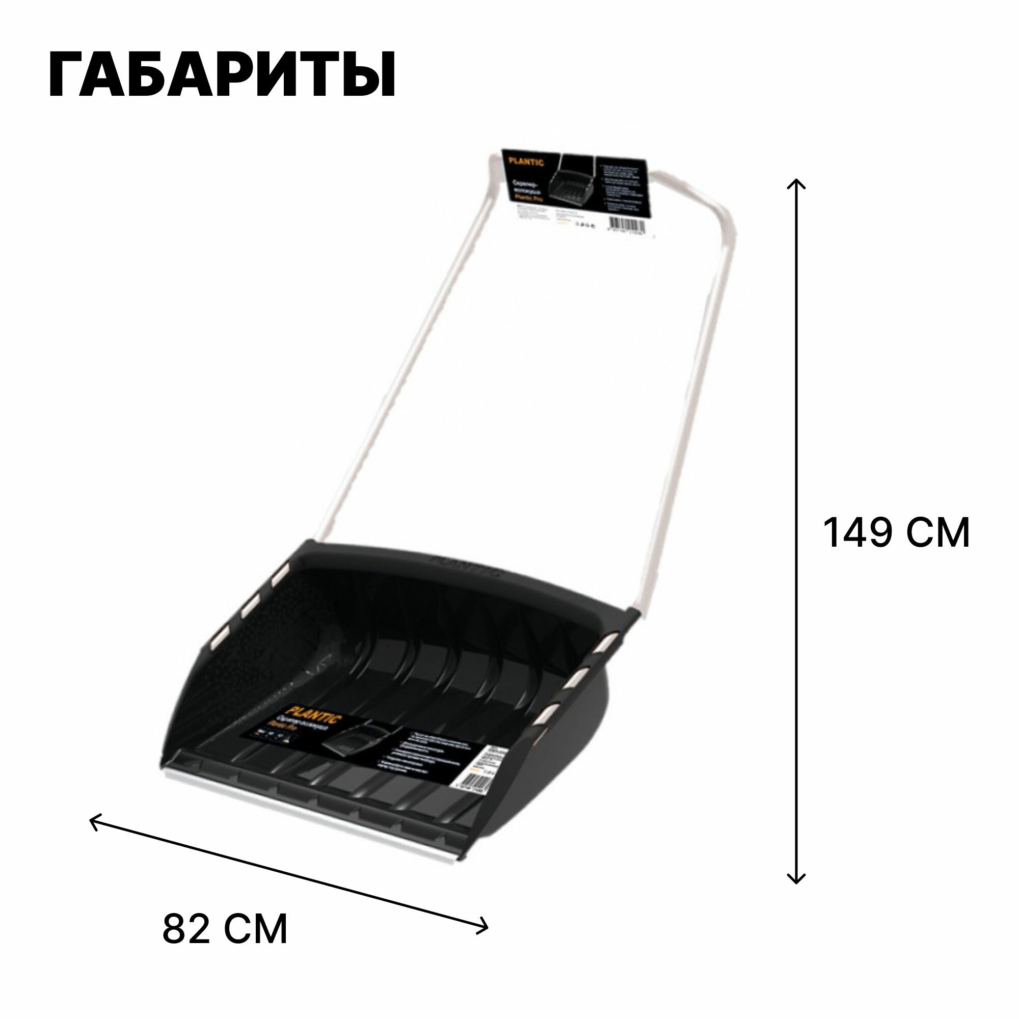 Скрепер для уборки снега Plantic Pro 12007-01, длинная рукоятка, ковш усилен алюминиевой кромкой, выпуклые ребра, черный