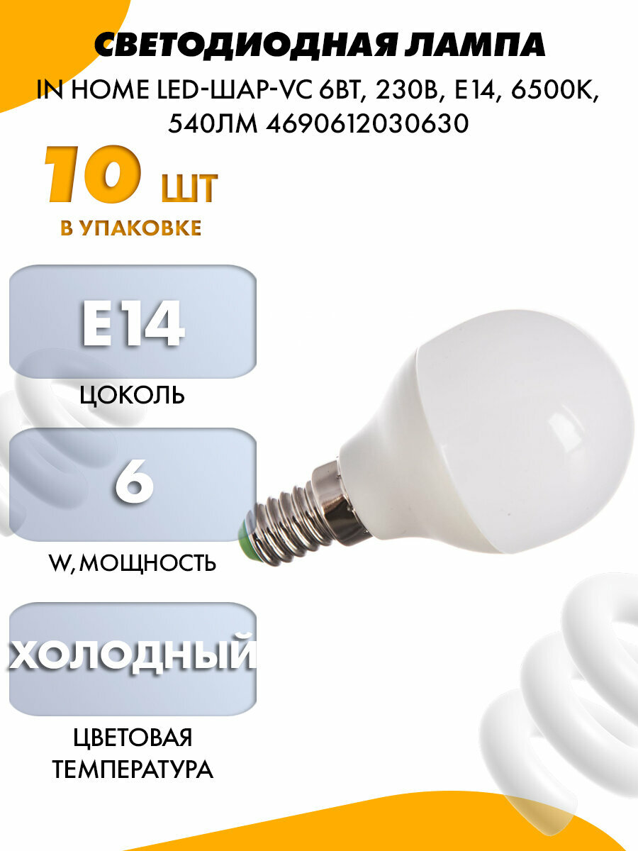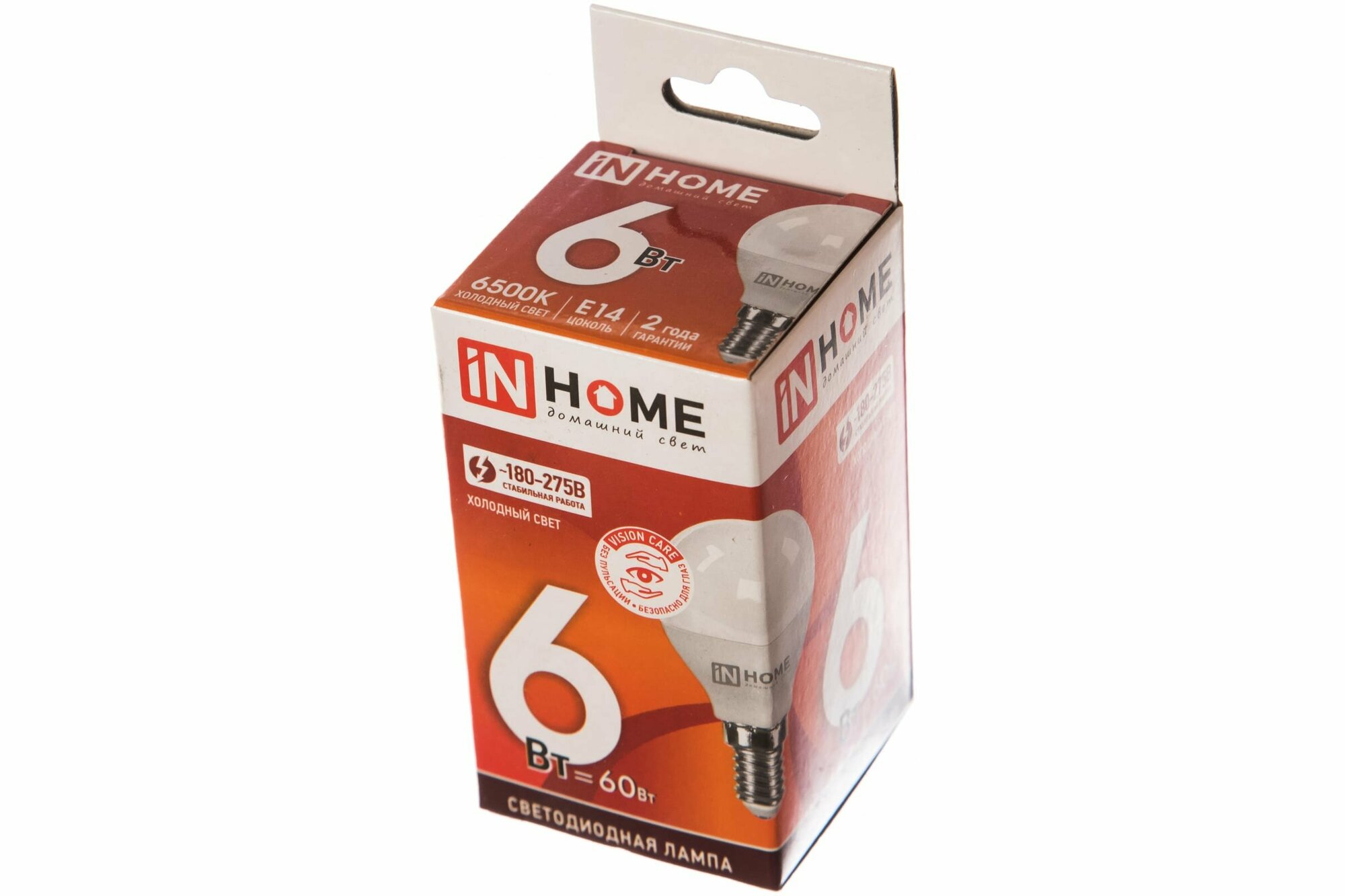 Светодиодная лампа IN HOME LED-ШАР-VC 6Вт, 230В, Е14, 6500К, 540Лм 4690612030630