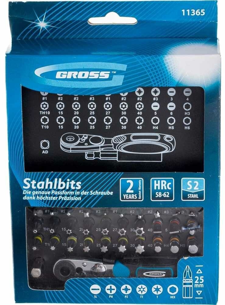 GROSS Набор бит, 1/4, магнитный адаптер, сталь S2, пластиковый кейс, 33 предмета Gross, ( 11365 )