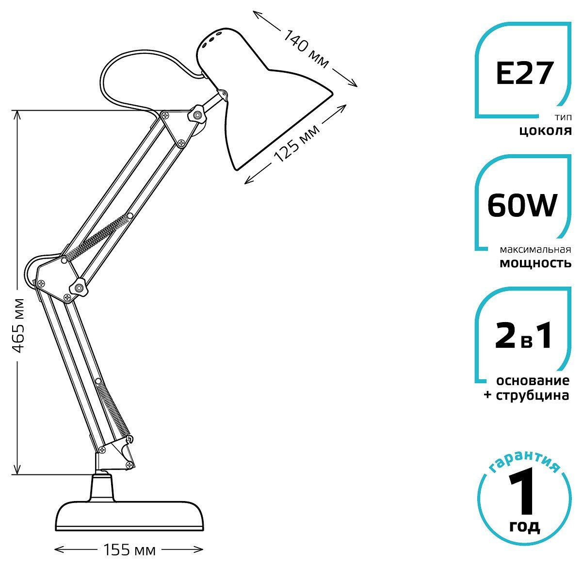 Светильник настольный Gauss модель GTL002 60W 220-240V E27 белый струбцина и основание 1/12