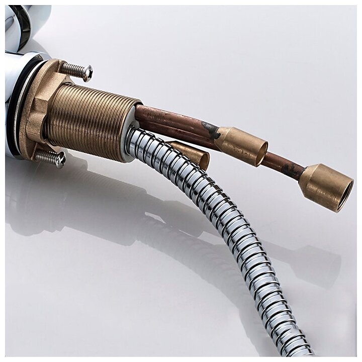 | Минусы: | Подключение холодной и горячей воды не соответствуют фото товара на сайте. Вместо 3-х медных выводов для подключения, присутствует только один. Шланги холодной и горячей воды вкручены напрямую в кран. Если нужно большая длина шлангов нужно будет либо, докупать переходники, либо устраивать " танцы с бубном" по выкручиванию штатных и закручиванию шлангов необходимой длины. |