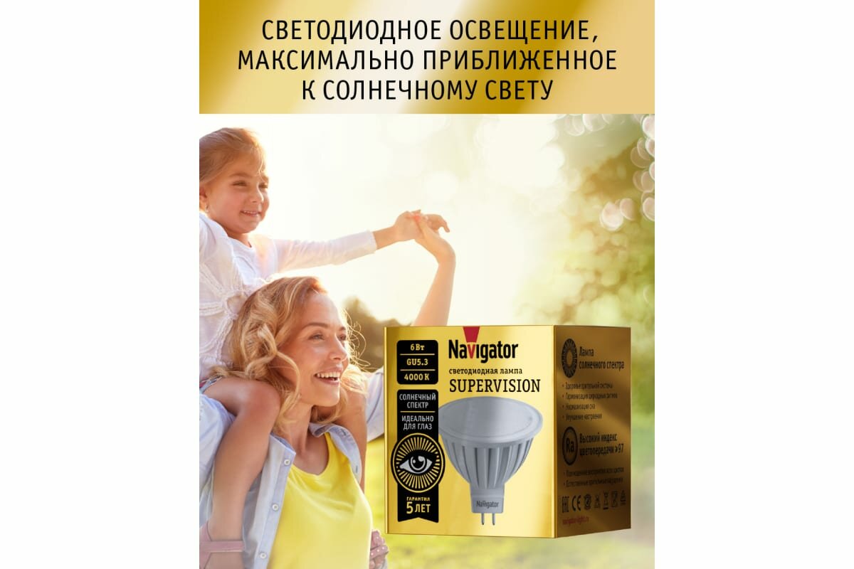Лампа светодиодная солнечного спектра Navigator Supervision, 6 Вт, рефлектор MR16, цоколь GU 5.3, теплого света 3000К