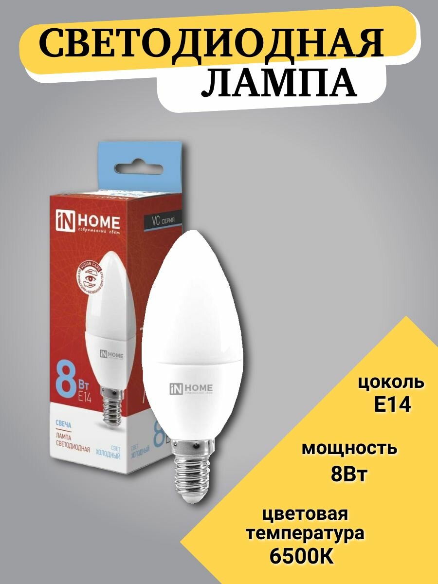 СохранитьЛампа светодиодная IN HOME LED-СВЕЧА-VC, E14, C37, 8 Вт, 6500 К интересное: