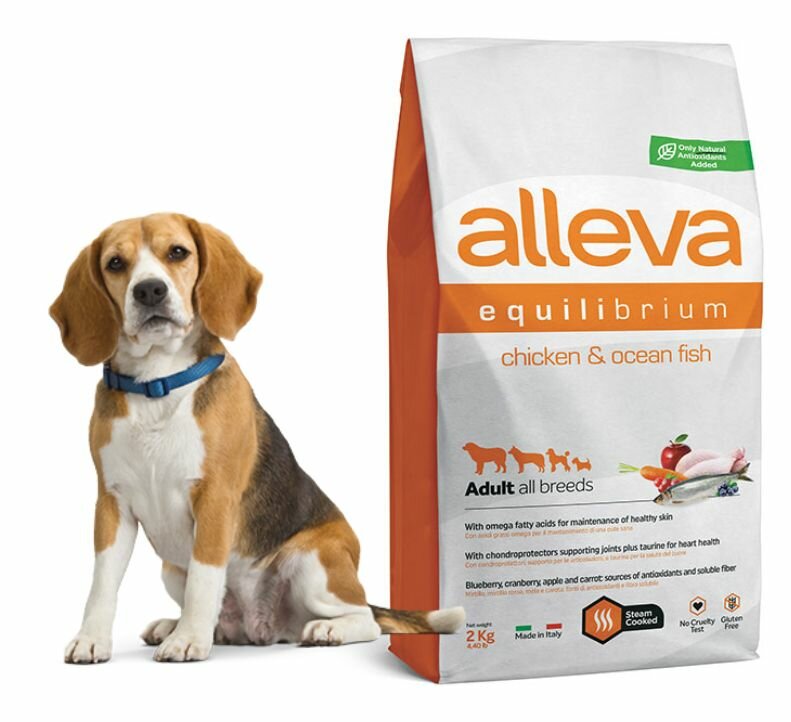 ALLEVA Полнорационный корм для взрослых собак всех пород. Курица с рыбой. 2 кг.