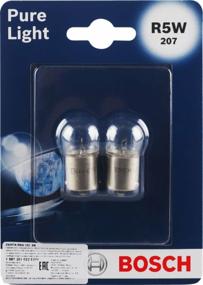 BOSCH 1987301022 Комплект ламп накаливания блистер 2шт R5W 12V 5W BA15s Pure Light (стандартные характеристики) 1шт