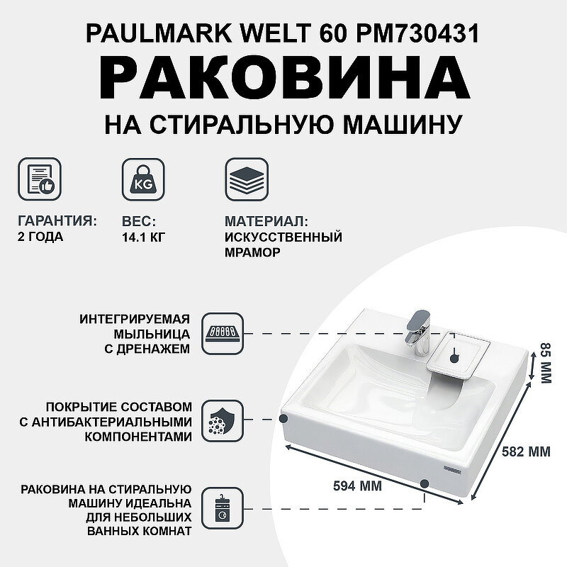 Раковина над стиральной машиной WELT 730431, белая, 60х60, с комплектом, Paulmark