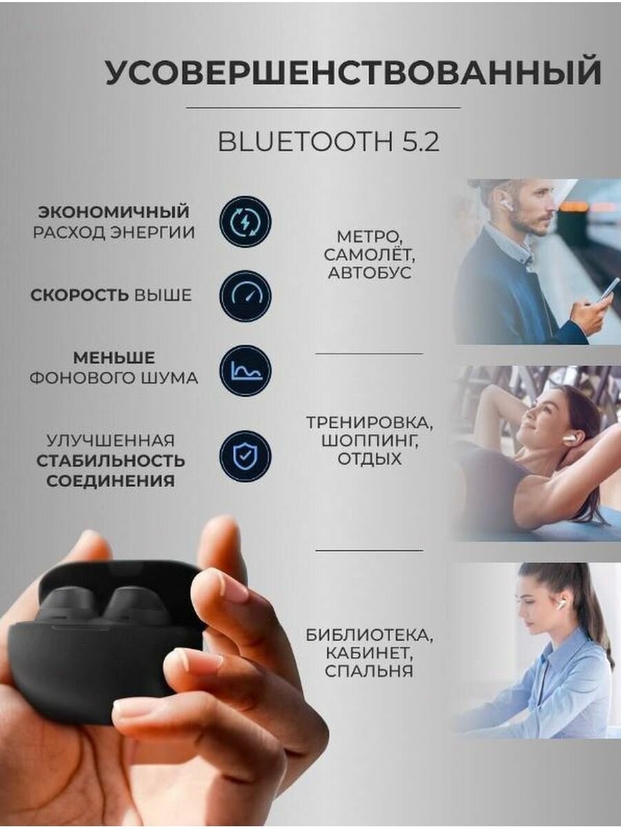| Плюсы: | Звук шикарный за такую цену. Стерео звук. Сенсор срабатывает сразу. Сидят надёжно, не выпадают. Дискомфорта нет. Заряд держит долго. |