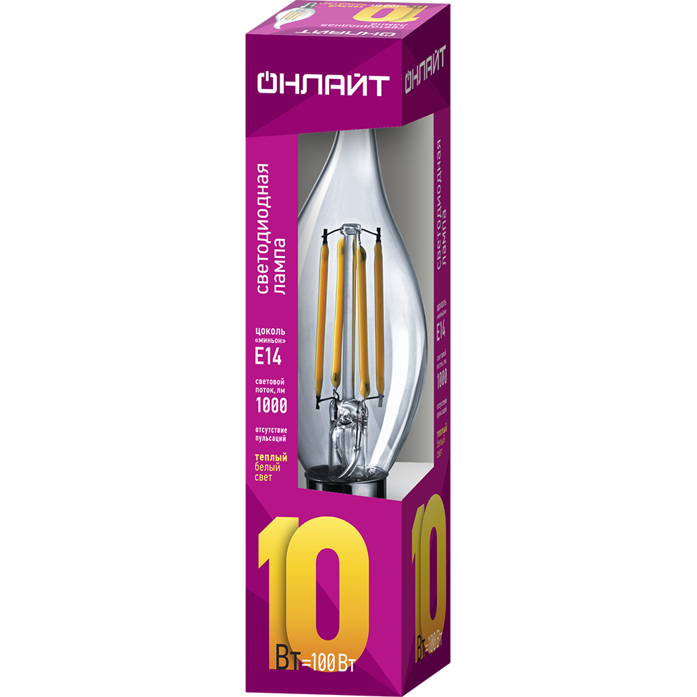 Лампа светодиодная филаментная онлайт 80 899, 10 Вт, свеча на ветру Е14, дневной свет 4000К, упаковка 10 шт.