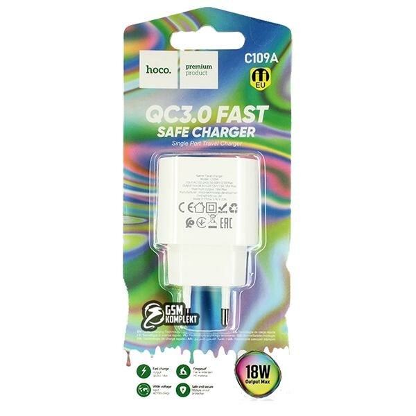 Сетевой адаптер - Hoco C109A USB, 3A/18W, с быстрой зарядкой, белый, 1 шт.