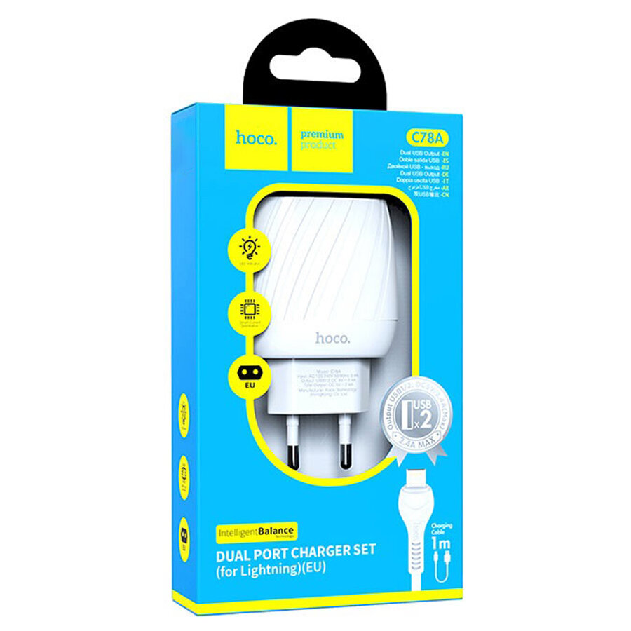 Сетевое зарядное устройство (СЗУ) Hoco C78A (2 USB) + кабель Lightning, 2.4 А, белый