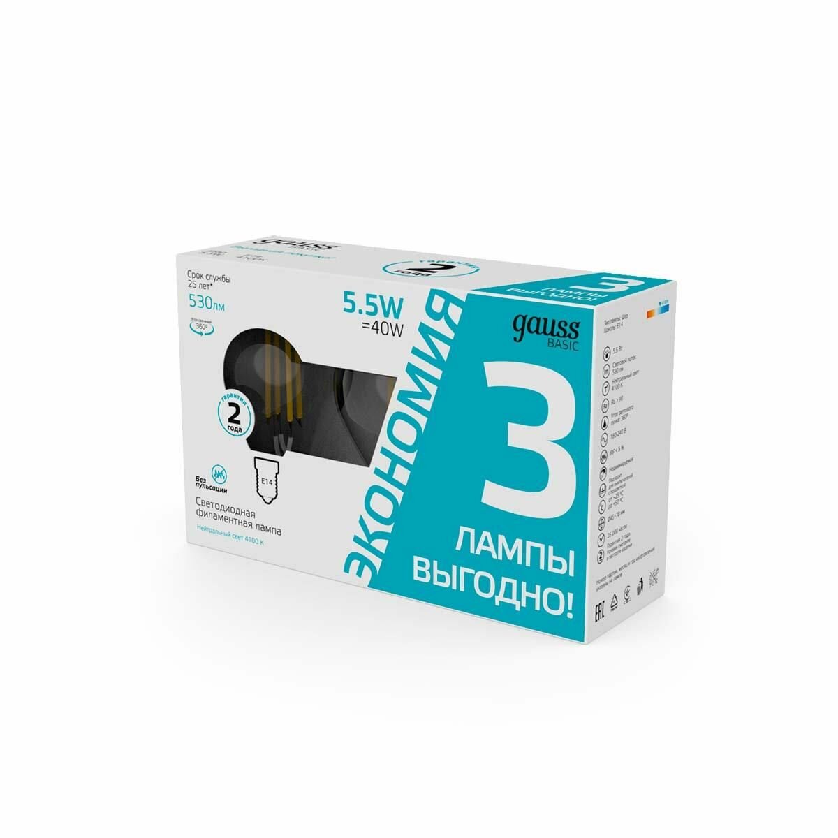 Лампочка светодиодная Е14 Шар 5,5W нейтр-белый свет 4100К (3 лампы в комплекте) Gauss Basic Filament
