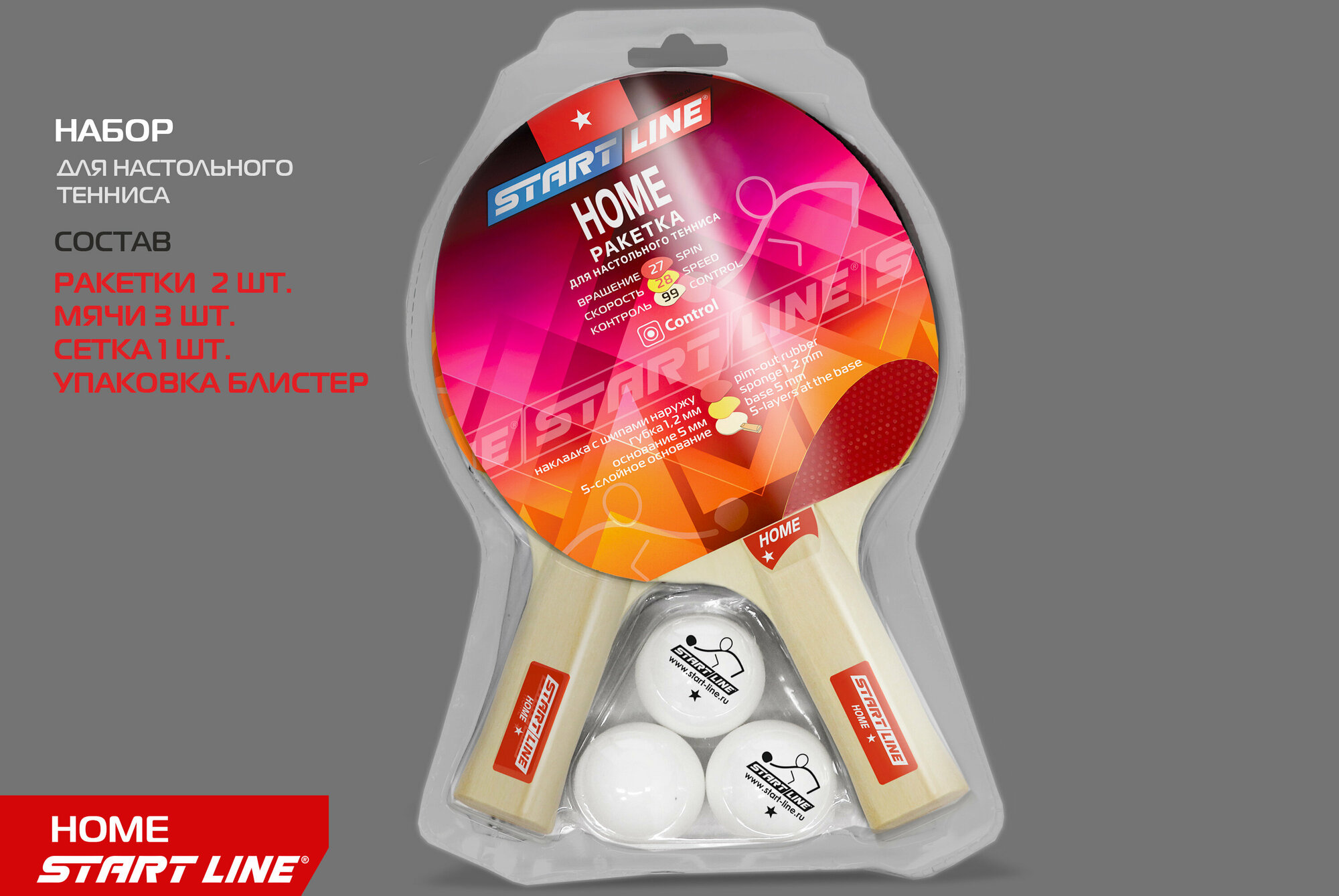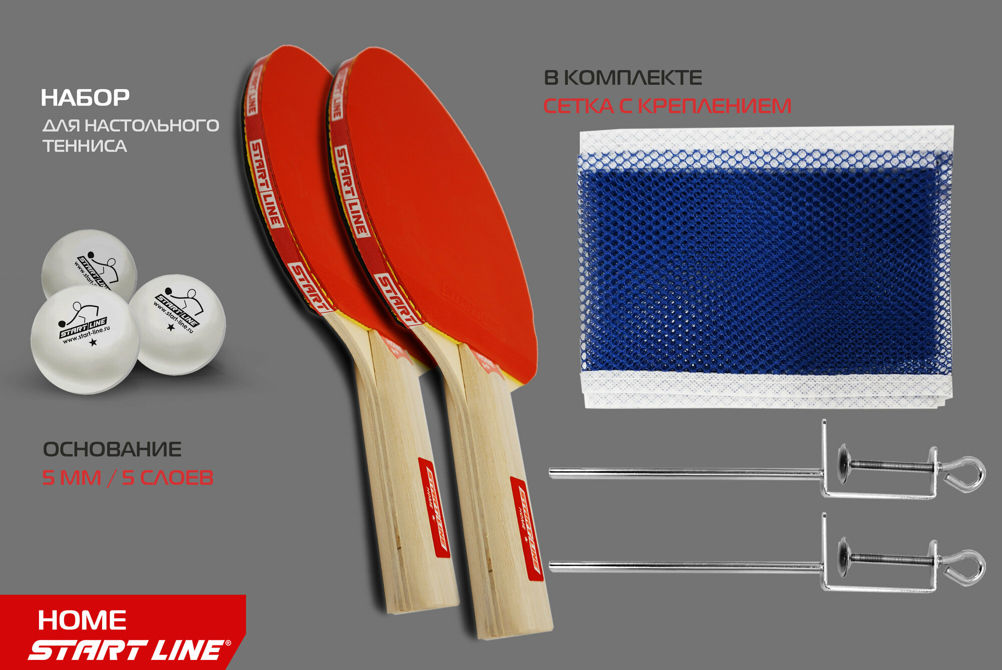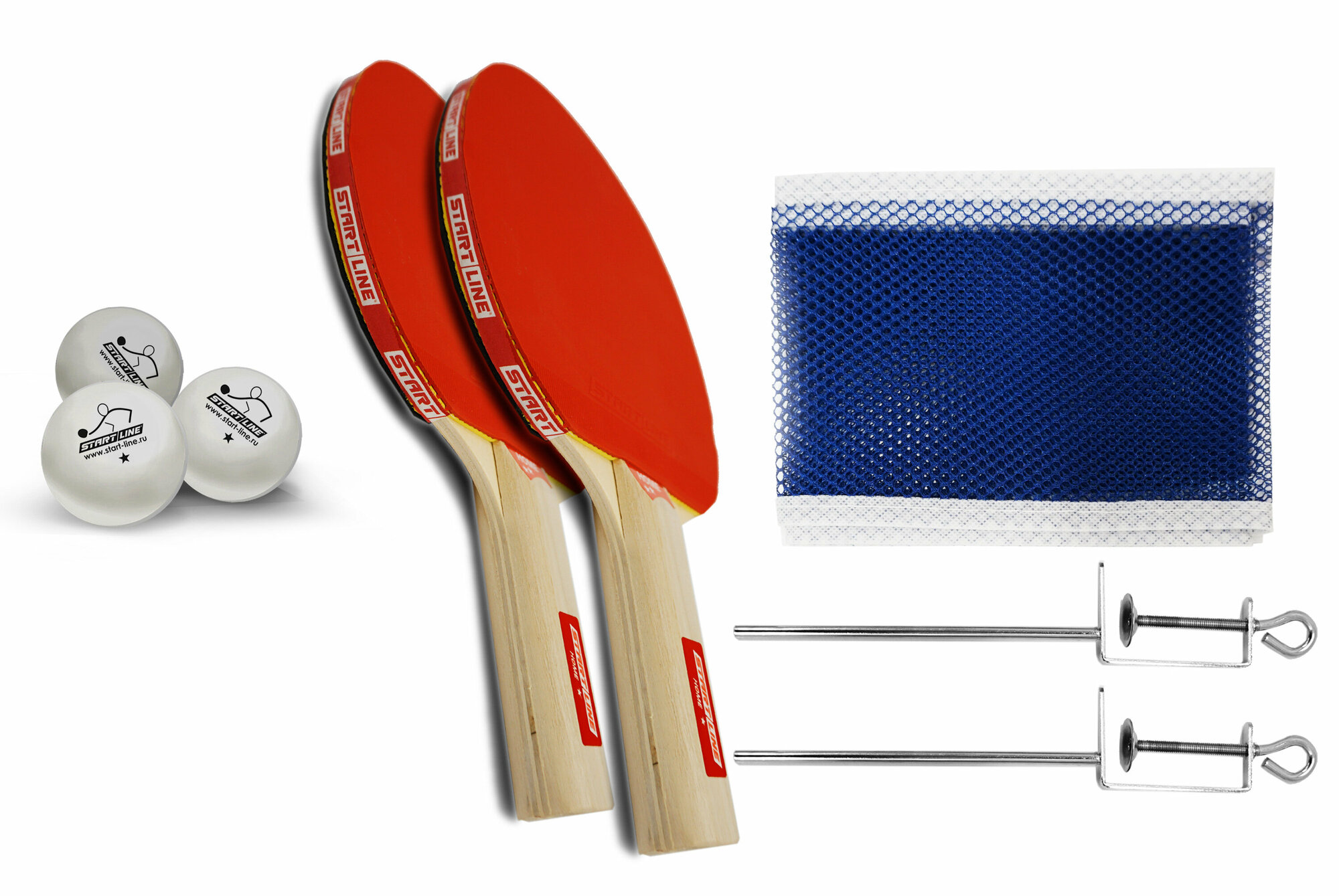 Набор START LINE: 2 Ракетки Home 1 звезда, 3 Мяча, Сетка с креплением, упаковка блистер