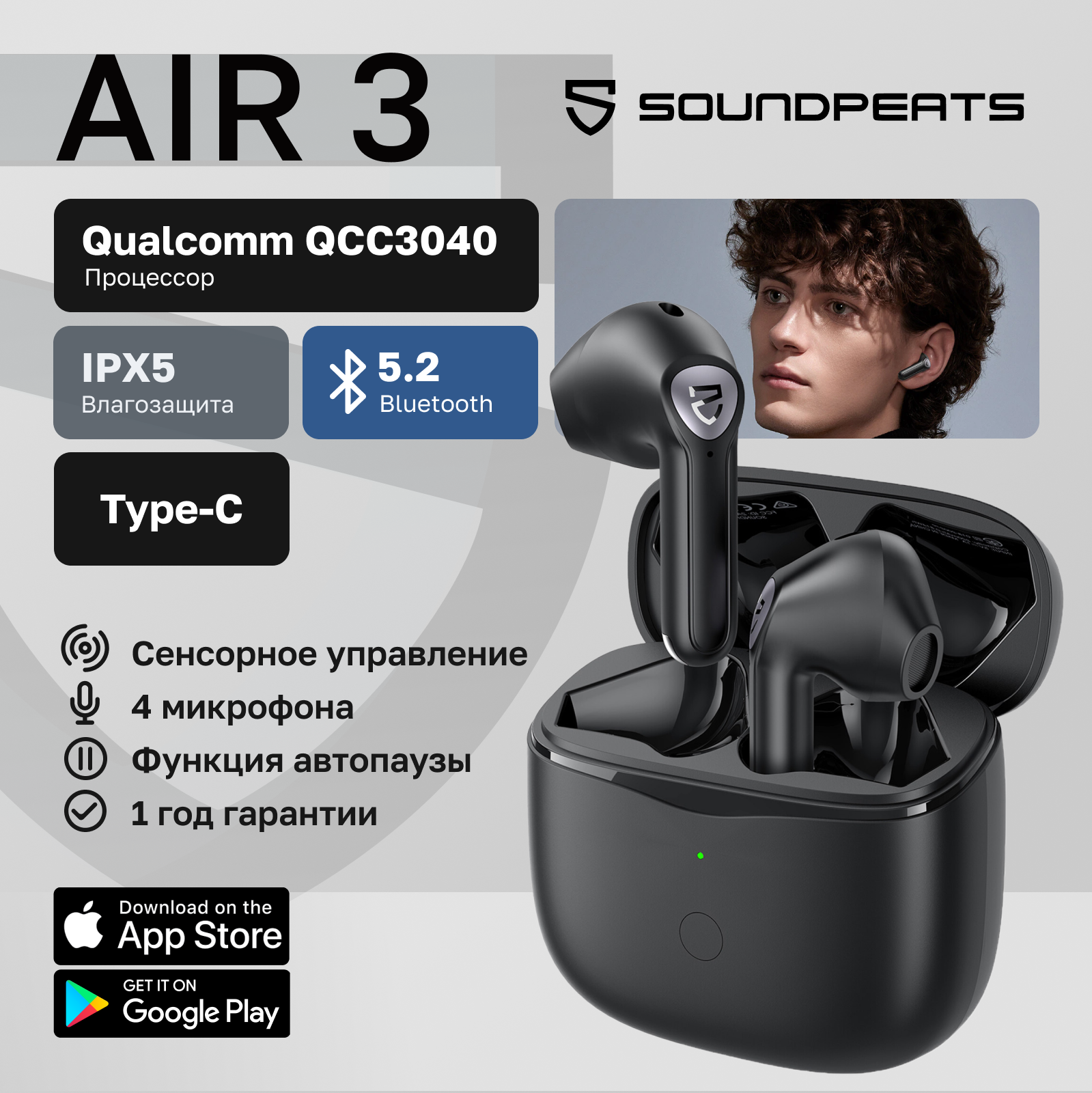 Беспроводные наушники SoundPeats Air3 TWS черные, Bluetooth 5.2 гарнитура с сенсорным управлением и автопаузой