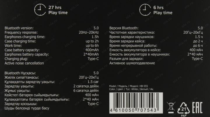 | Комплектация | наушники, Type-C кабель для зарядки, силиконовые накладки |