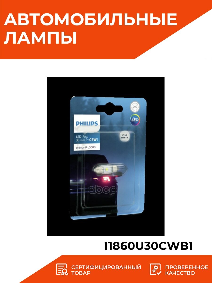 Купить PHILIPS 11860U30CWB1 Лампа светодиодная c5w 12V Festoon LED (30mm) 1шт блистер (белый свет)