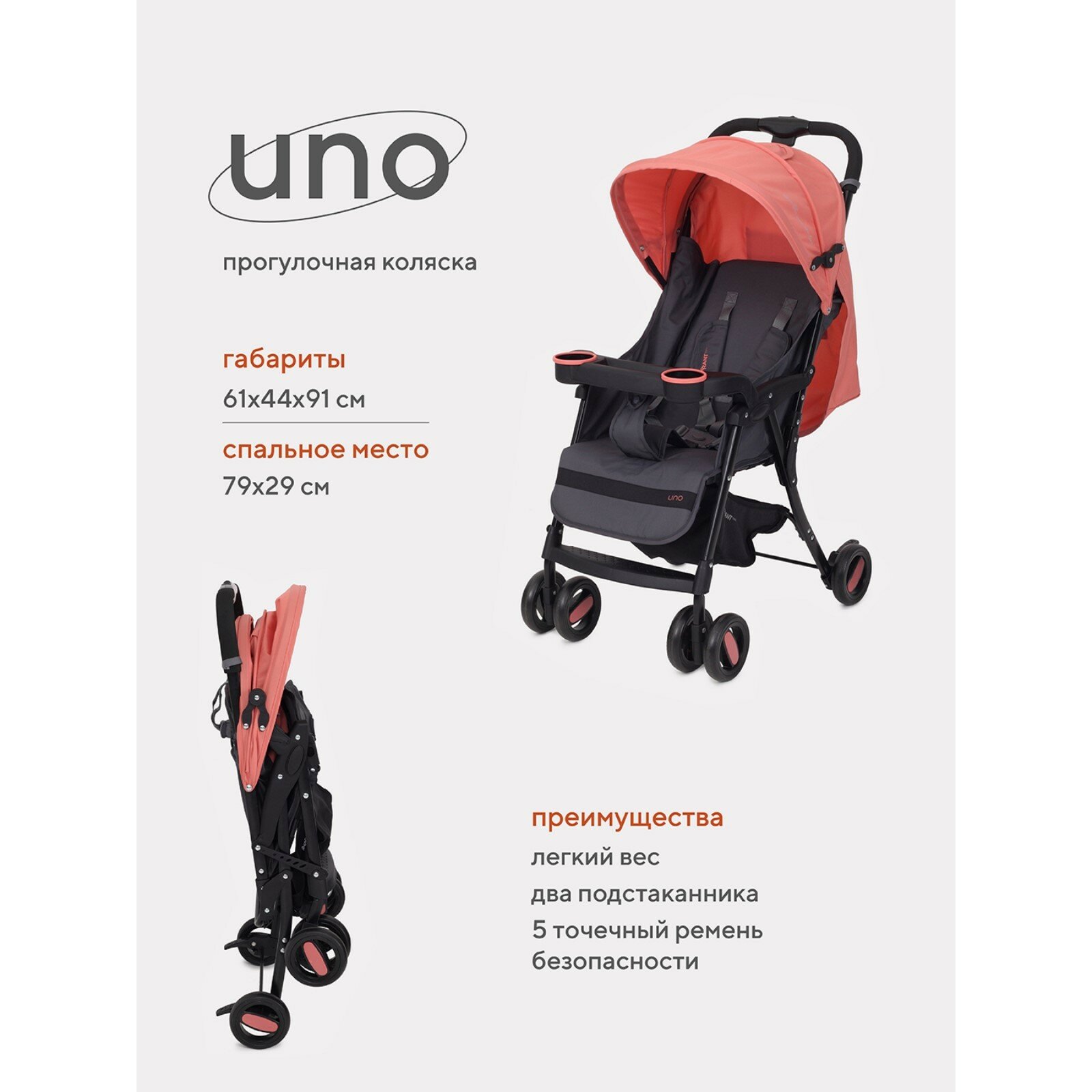 Коляска прогулочная детская RANT basic «UNO», складывается в трость, цвет Cloud pink