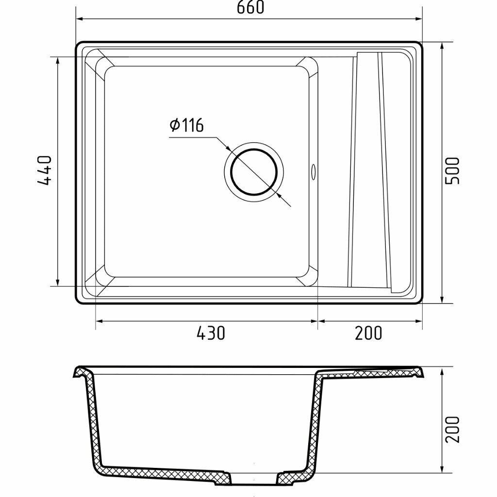 Кухонная мраморная мойка GranFest LEVEL GF-LV-660 L, прямоугольная, врезная, оборачиваемая, 660*500 мм, цвет черный/Раковина для кухни